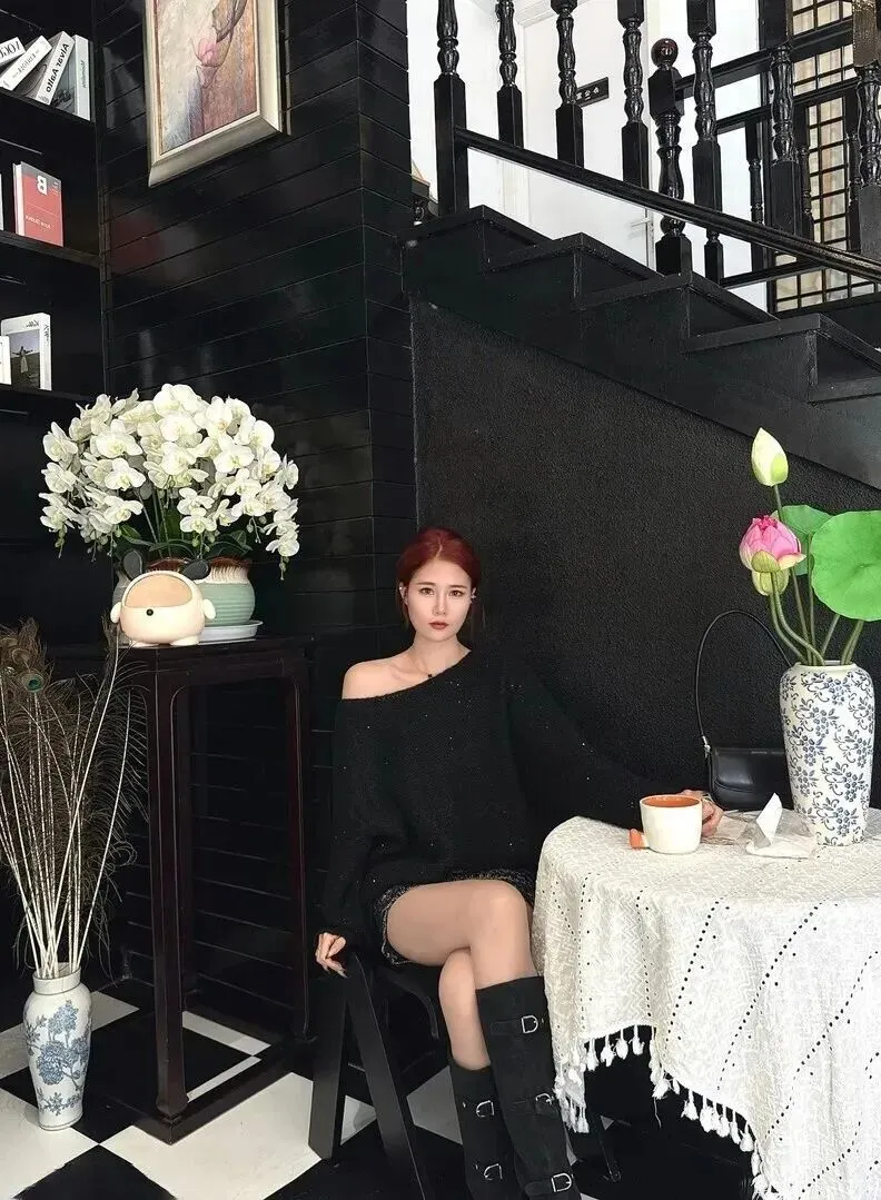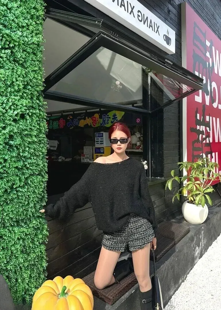 户外咖啡.馆的.阳光.透过树叶照.在身上.,露肩设.计增.加了一点.小性.感。长靴配.短裤的好.处就是,坐.下也不用.担心走.光。全身黑.色但一点.不无聊,毛.衣和靴子.颜色连贯显.高,短裤.的深色格.纹刚.好过渡层次.