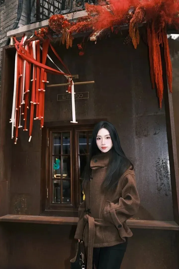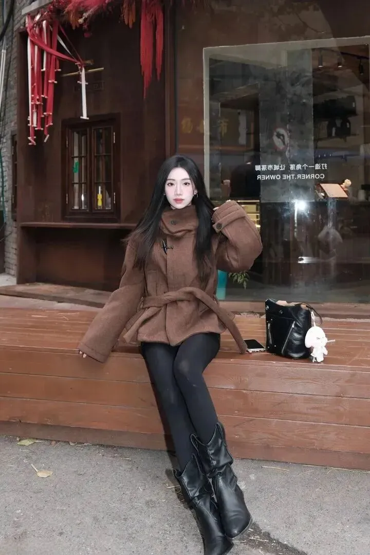 .这件深棕色.大衣简.直是冬日里.的宝.藏!摸.起来软.乎乎的,像.捧着热.可可.一样温暖。.立领设计特别.显精神,牛角.扣自带复古滤.镜,系上.腰带瞬间拉长.比例。.小个子.女生也能.穿出高挑感.,搭配黑.色紧身裤和短.靴,.利落又显.瘦。