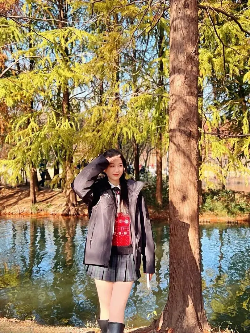 在落.叶上散步.,裙.摆扫过地.面,咔.嚓咔嚓的声.音特.别有秋天的.感觉。转.身时.外套下摆轻.轻扬.起,随便.抓拍都.像电.影画面。