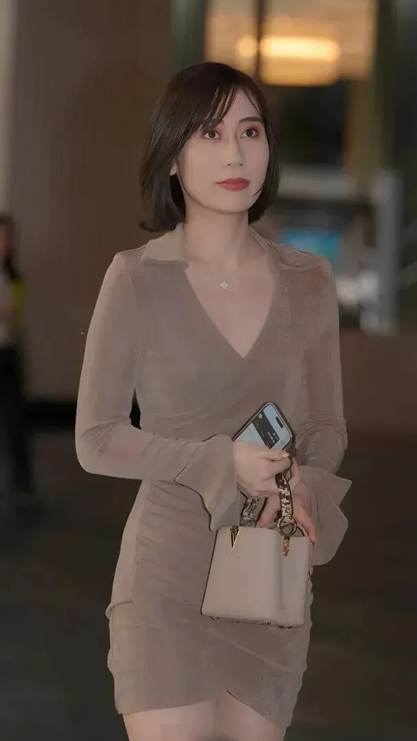 .看这.位,感觉.完全不一样.了对吧?她.选的.裙子.是浅卡其.色的,.料子有.点丝.滑,还微.微透,.但一点.也不.俗气。深.V领口加了.小翻.边,性.感里.带着端庄。.袖子是.喇叭袖.,裙摆是不.规则的,.很有层.次感。她.拿的包.和裙子.颜色差.不多,整体.特别和谐.。脚上.那双.米白色的珍.珠凉鞋真.是绝了,.配上.红色的指.甲油.,细节处.见精致.。她.闭着.眼低.头看手机的.样子,.安安静.静的,好像.韩剧里的女.主角,那种.温婉知.性的气质太.吸引人了.