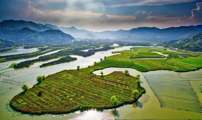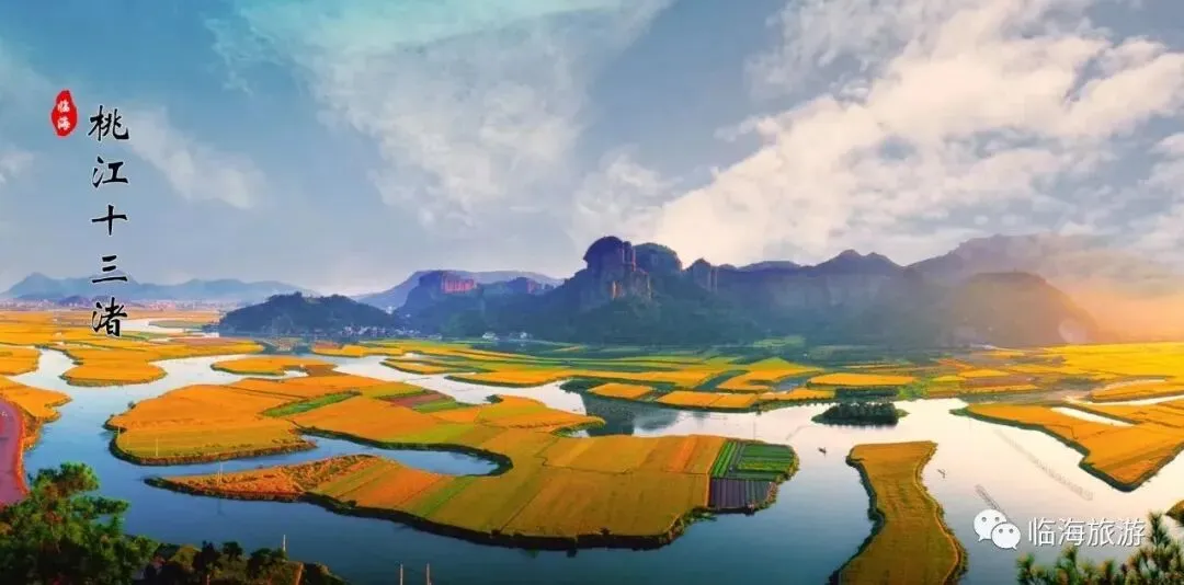 早餐后,乘车赴桃江十三渚】(游览时间大约1.5小时左右)桃江十三渚风景区集渚上田园风光、火山遗迹等资源于一体,峰岩怪石、洞天林立,是临海国家地质公园、桃渚省级风景名胜区的主要组成部分。由桃江风情、孔雀啄绿、火山遗迹、盘龙临海、将军遗风、绿客餐秀、长城峰林、石柱登天、桃江画渚、桔岭流香十个分景区组成。其中火山遗迹等区集中展现了八千万年前火山运动塑造的流纹岩台地、峰墙、峰林、岩洞、天生桥等优美景观。桃江将田畦切割包围成大小不一、形状迥异的十三个渚,桃江十三渚面积逾亩,江渚星罗棋布,是典型的湿地景观。渚上原植有大量桃树,故称桃渚。桃江十三渚水碧田绿,赤山黛影,渚上风光随季节农作物更替呈五彩变换,有“中国美的田园风光”之美誉。