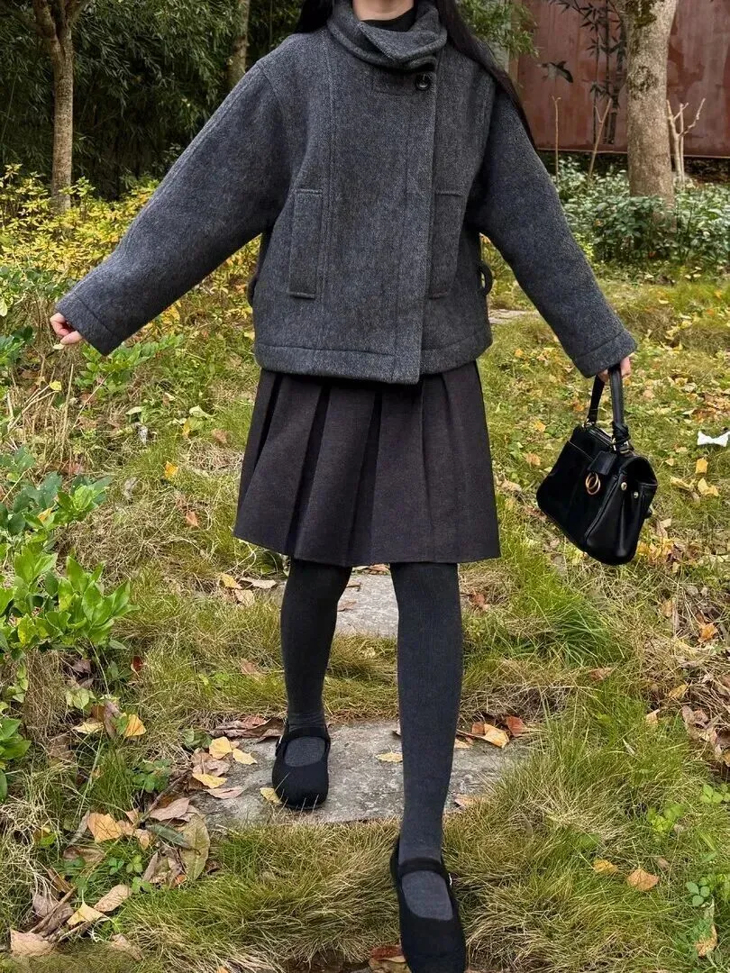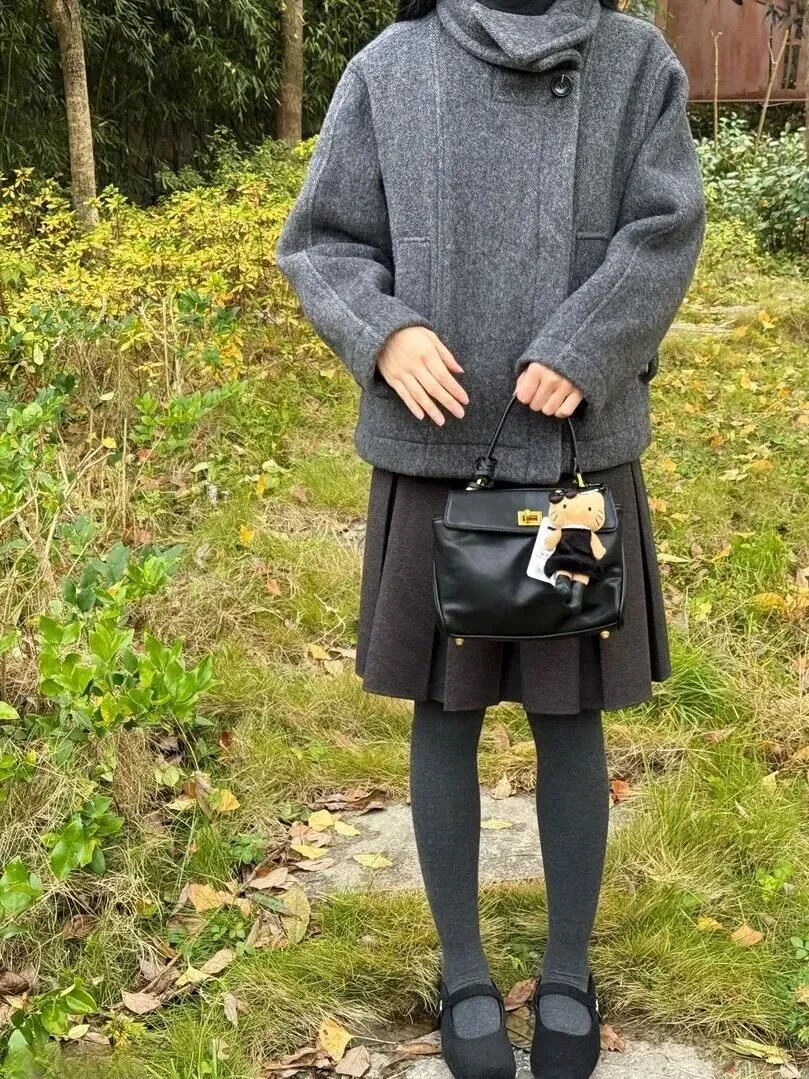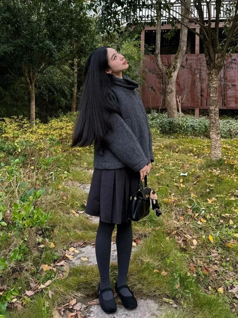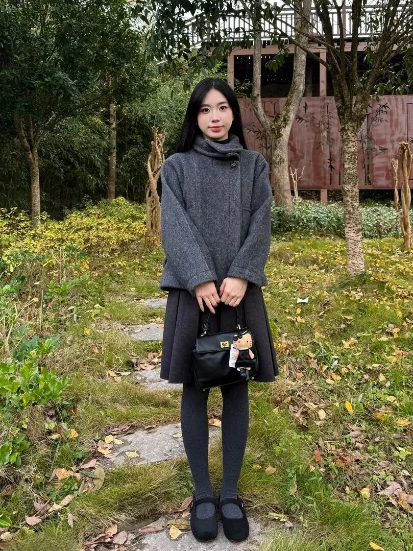 .很多人一.听到灰色.就觉得.单调。.其实.灰色穿好.了层次感特.别强.。比.如这件短款.高领大衣,.用的.是羊毛混纺.面料,.阳光下.看着.柔柔.的。里面搭.一条深.灰色.百褶裙.,裙摆随.风轻轻晃.动,露出.一点点灰色.连裤袜。从.上到.下颜色.由浅到深,.整体就显.得很协调。.脚上那双.黑色平底.鞋,鞋头带.个金属.扣,简.单又.有点小设计.,不会太.抢眼。