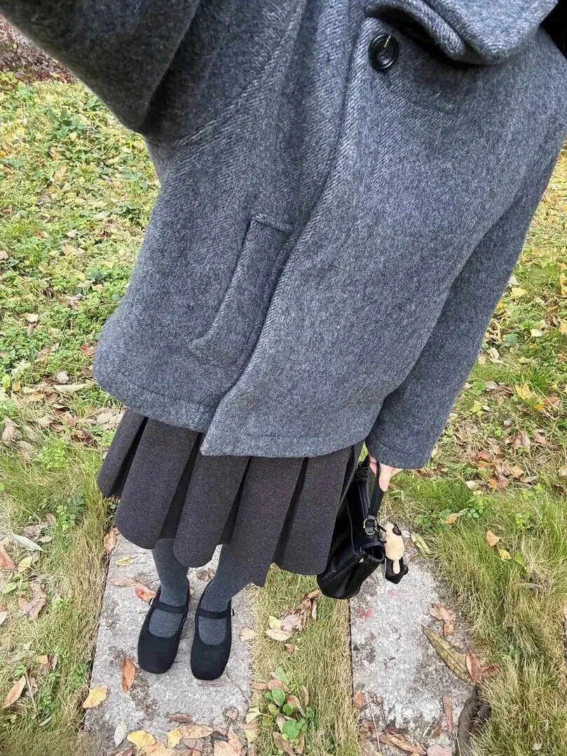 .气好的时.候去公.园野餐,.这套穿搭拍.照超级上镜.。浅灰色.大衣和.黄色落叶.形成.对比,百褶.裙被风.吹动,拍出.来像杂.志大.片。