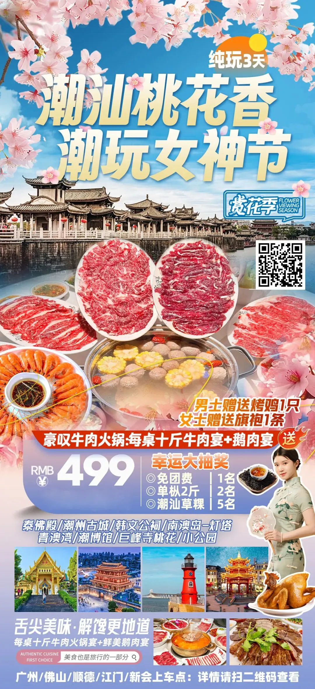 潮汕桃花香潮玩女神节抽大奖送豪礼南澳岛美食纯玩3天,泰佛殿、潮州古城灯光秀、湘子桥、韩文公祠、潮汕功夫茶艺表演、南澳岛灯塔、青澳湾、潮汕历史文化博览中心、巨峰寺桃花、汕头小公园。