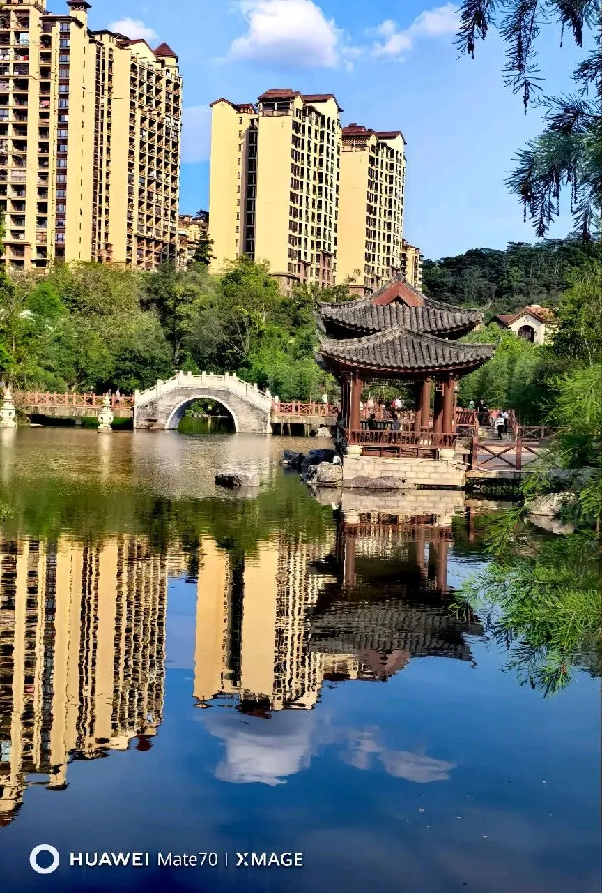 沿山而建的泡池郁郁葱葱,林木遮掩...