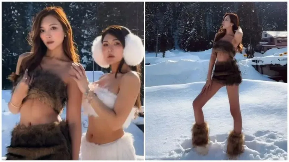 這套充滿原始狂野風的服裝由毛毛Tube Top及超短迷你毛毛裙組成,完美展現了她深邃的鎖骨、零贅肉的火辣纖腰,以及一雙出名吸睛的逆天長腿。她更配搭了同款的厚實毛毛腳套,在雪地中擺出名模級的高冷Pose,氣場十足。