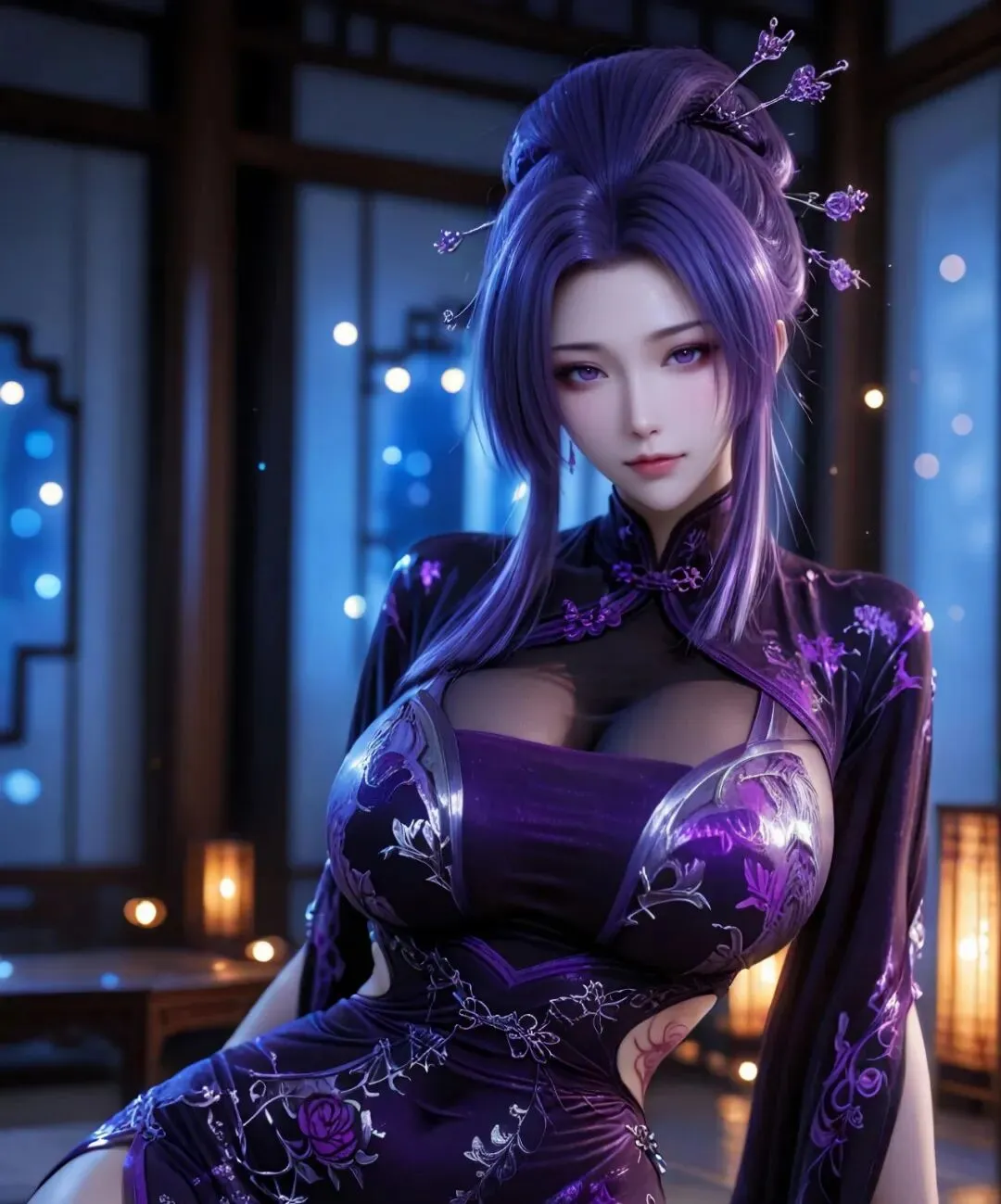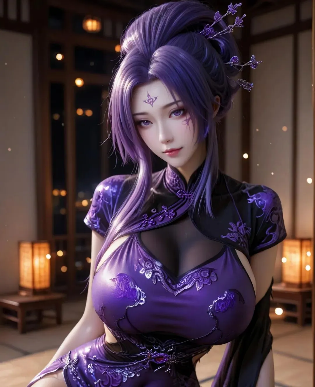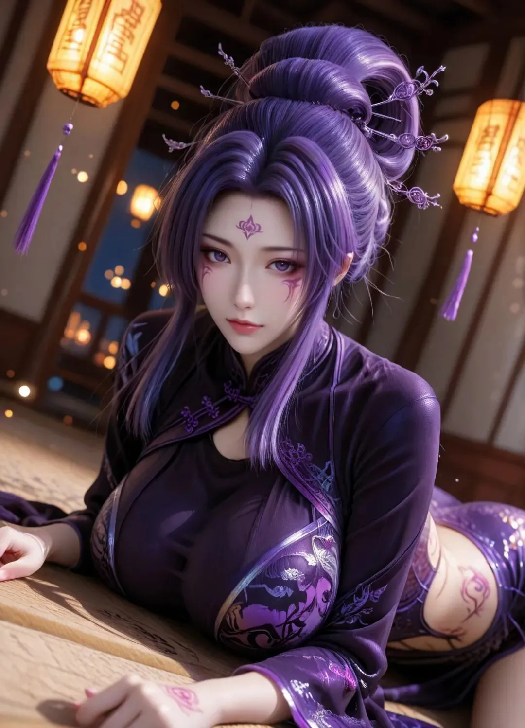 最具辨识度的,是她那头张扬而华贵的紫发。日常多挽成精致繁复的发髻,以银质簪钗固定,簪头常饰有细小的紫色宝石或镂空纹样,既显风情,又便于行动;偶尔放下长发,如紫色瀑布垂落腰际,发丝柔顺有光泽,随风轻扬时,更添几分慵懒与神秘。眉眼是她颜值的灵魂,眉如远山含黛,线条婉转,眉尾微微上挑,自带三分撩拨;眼型是标准的桃花眼,眼尾上翘,瞳仁是极浅的淡紫色,宛如浸在紫潭中的琉璃,平日里眼波流转,顾盼生辉,能轻易勾动人心;对敌时,眸光骤冷,紫意加深,如淬了冰的利刃,杀气逼人。