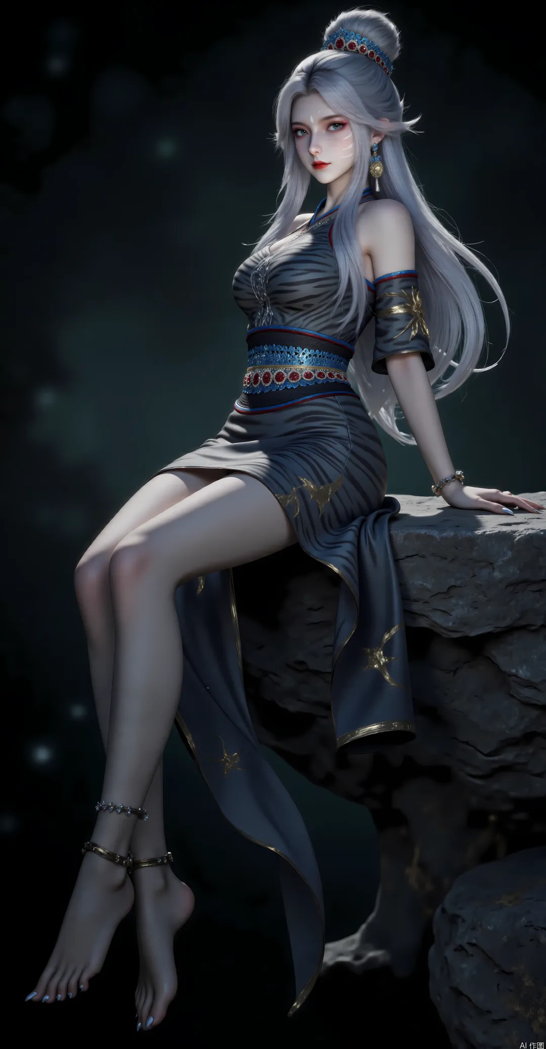 此时的他,配饰简约而实用,头上没有多余的装饰,只是用一根黑色的兽骨发簪将发丝松松束起,兽骨上刻着简单的白虎纹路,既是装饰,也是他的护身符,能辅助他稳定体内尚未觉醒的白虎妖力;耳间没有佩戴任何配饰,唯有那对可隐可现的白虎耳,彰显着他的妖神血脉;手上戴着一对细小的黑色兽皮手环,质地坚韧,是他猎杀蛮荒妖兽后所得,既能保护手腕,又能在战斗时辅助他凝聚妖力,手环上布满了细小的划痕,见证着他无数次的厮杀;脚上穿着一双轻便的兽皮靴,靴底刻着防滑纹路,适配蛮荒复杂的地形,靴筒上点缀着几缕银白色的虎毛,与他的白虎耳相互呼应。彼时的他,衣着野性,配饰简约,眼底满是桀骜与警惕,宛如一只生长在蛮荒丛林中的幼虎,灵动而凶猛,一心只想活下去,只想觉醒自己的血脉,查清自己的身世,未曾想过,一场血脉觉醒,会彻底改变他的一生。
