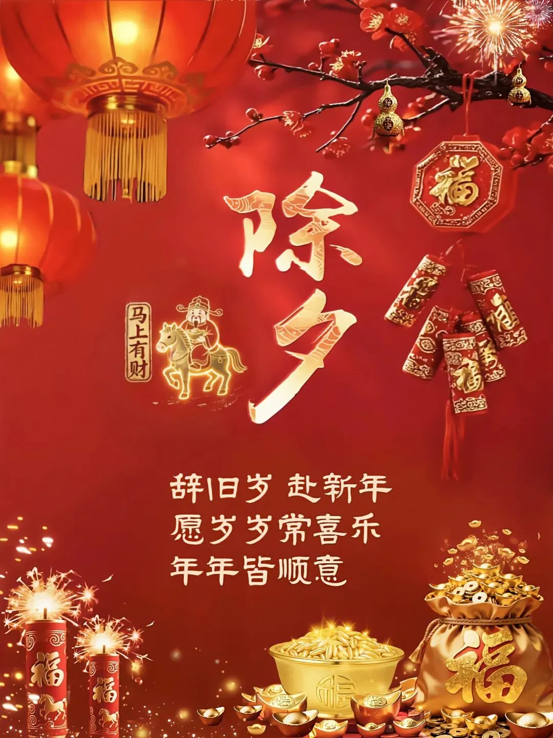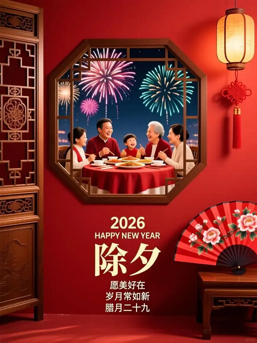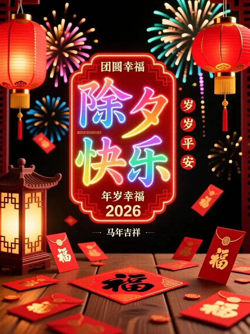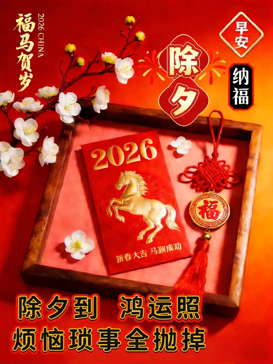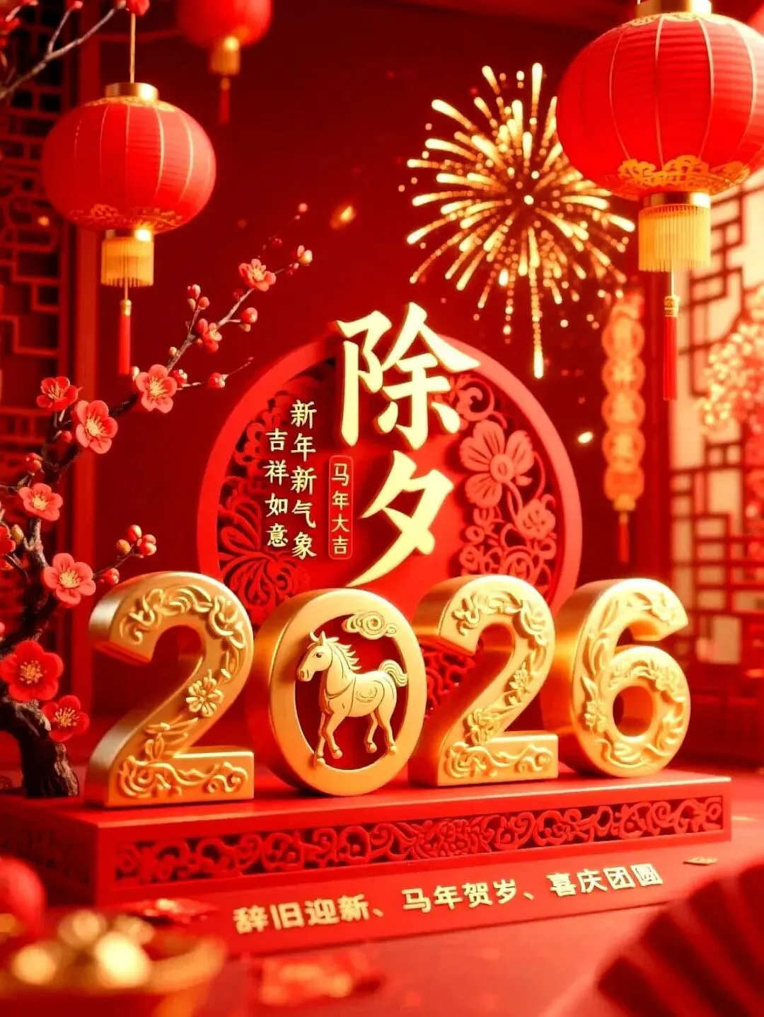 🌸🧨✨除夕到,祝福到!除夕除夕,除尽烦恼,迎接希望。愿亲爱的家人和朋友们,岁岁常欢愉,万事皆胜意。2026 马年,愿你心想事成,事事顺心,好运常伴,马年大吉!🐎🍀🏮