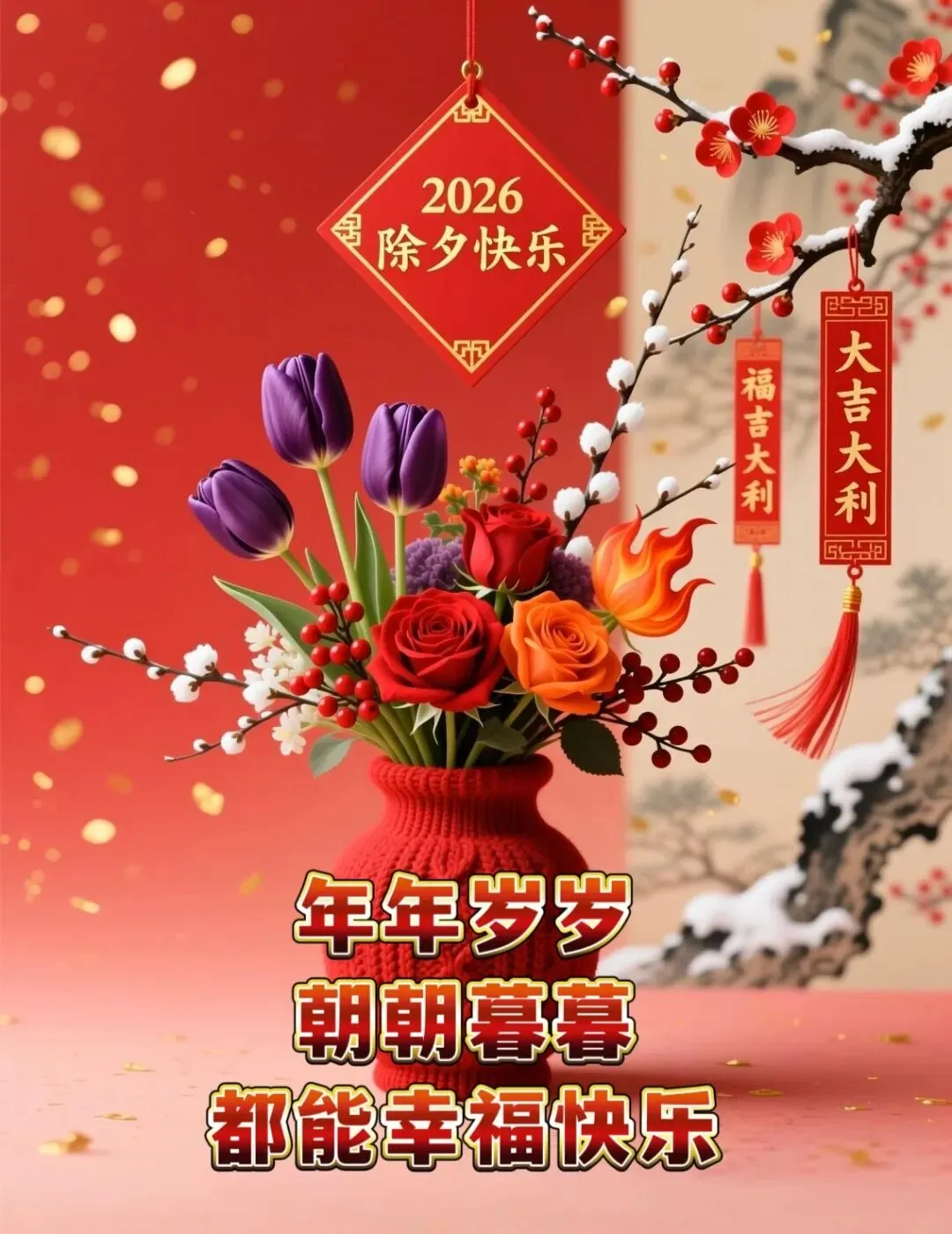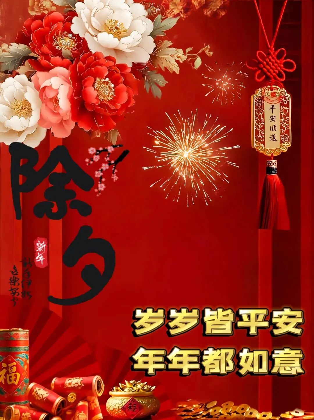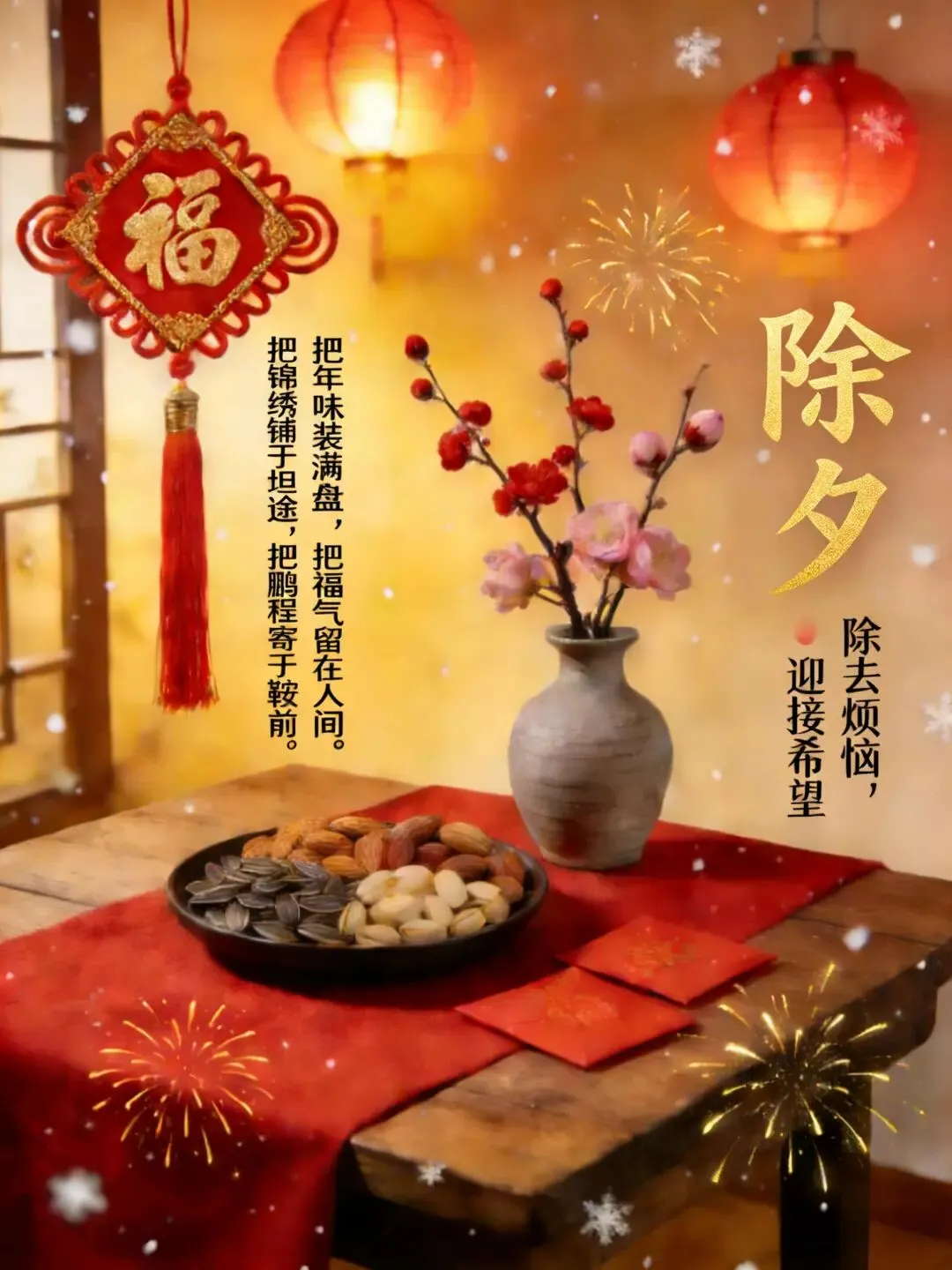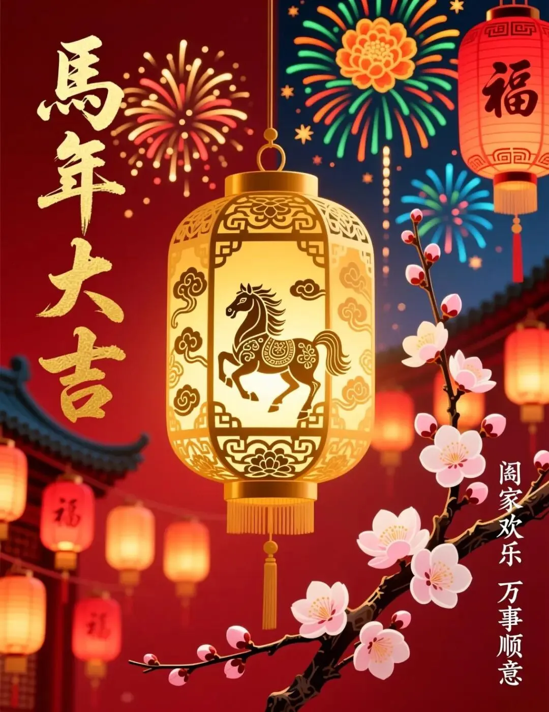 🌸🧨✨除夕到,祝福到!除夕除夕,除尽烦恼,迎接希望。愿亲爱的家人和朋友们,岁岁常欢愉,万事皆胜意。2026 马年,愿你心想事成,事事顺心,好运常伴,马年大吉!🐎🍀🏮