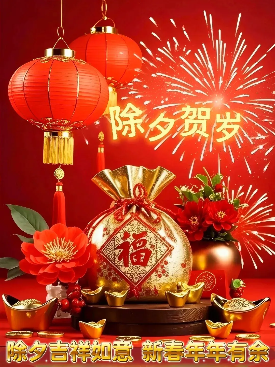 🎆🔥✨除夕到,红红火火喜气旺,烟花灿烂映满堂。新的一年万事顺,好运连连不停忙。和和美美全家福,甜甜蜜蜜笑颜开。祝福除夕欢乐多,幸福快乐过马年!❤️👨‍👩‍👧‍👦🐎