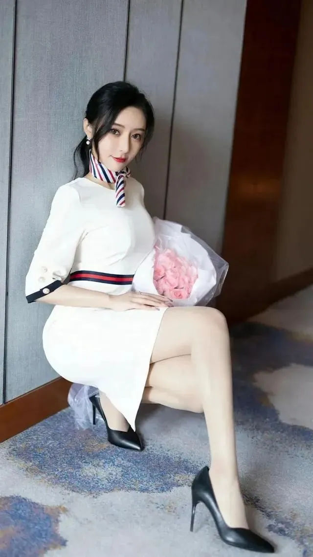 白色制服连衣裙,脖子上系着条纹丝巾,搭配超薄肉色丝袜,脚踩黑色高跟鞋,这套空姐制服的穿搭,非常优雅、高级