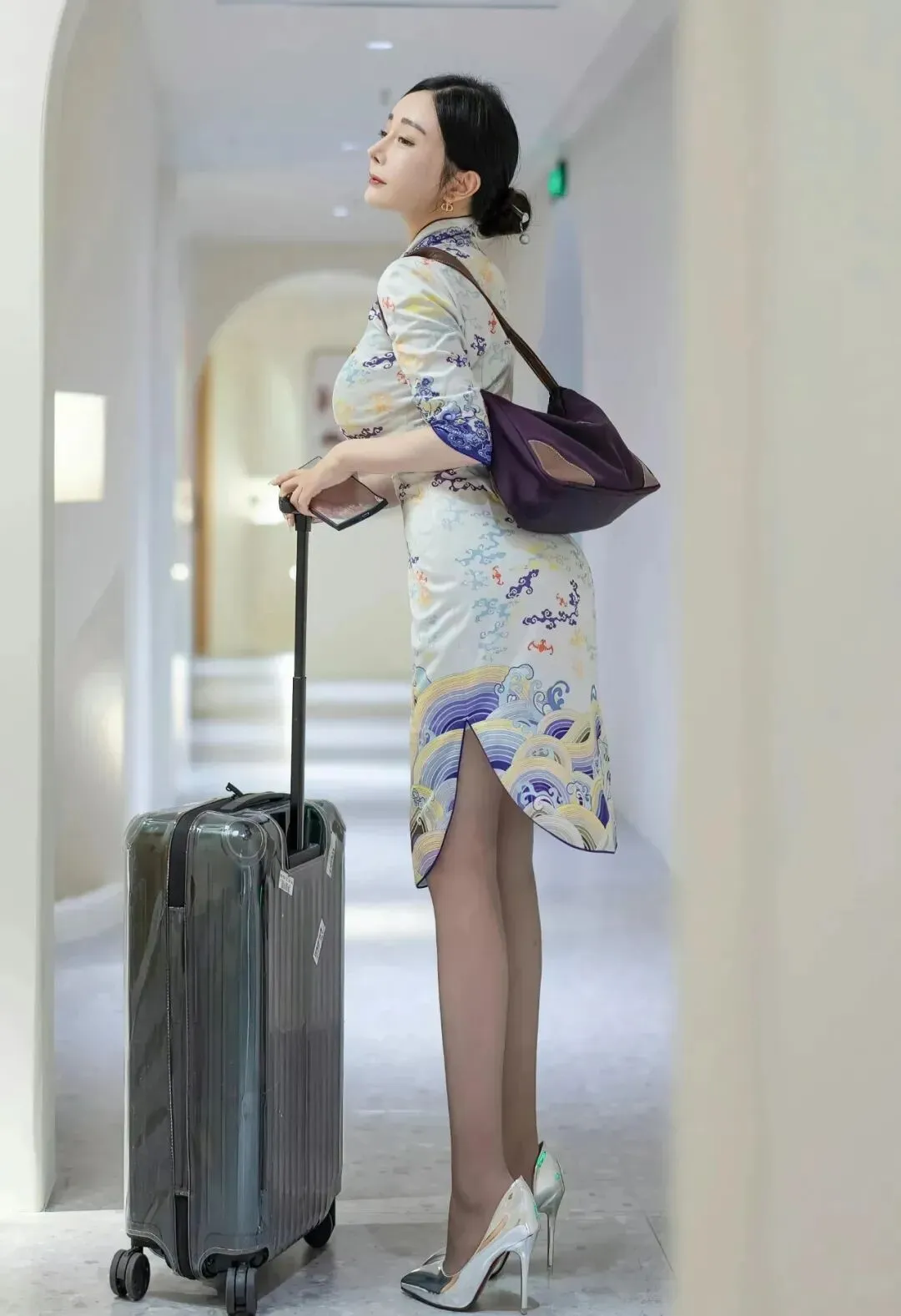 青花瓷的中式旗袍,搭配黑丝和亮银色高跟鞋,国风旗袍,确实好看,特别凸显身材,能完美的勾勒出身材的优美曲线。