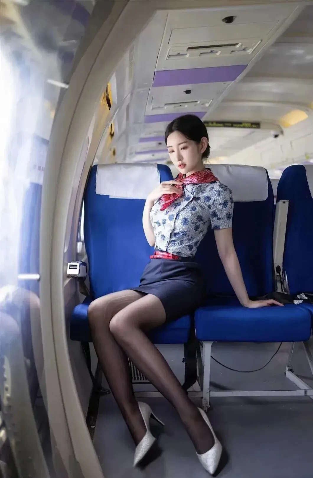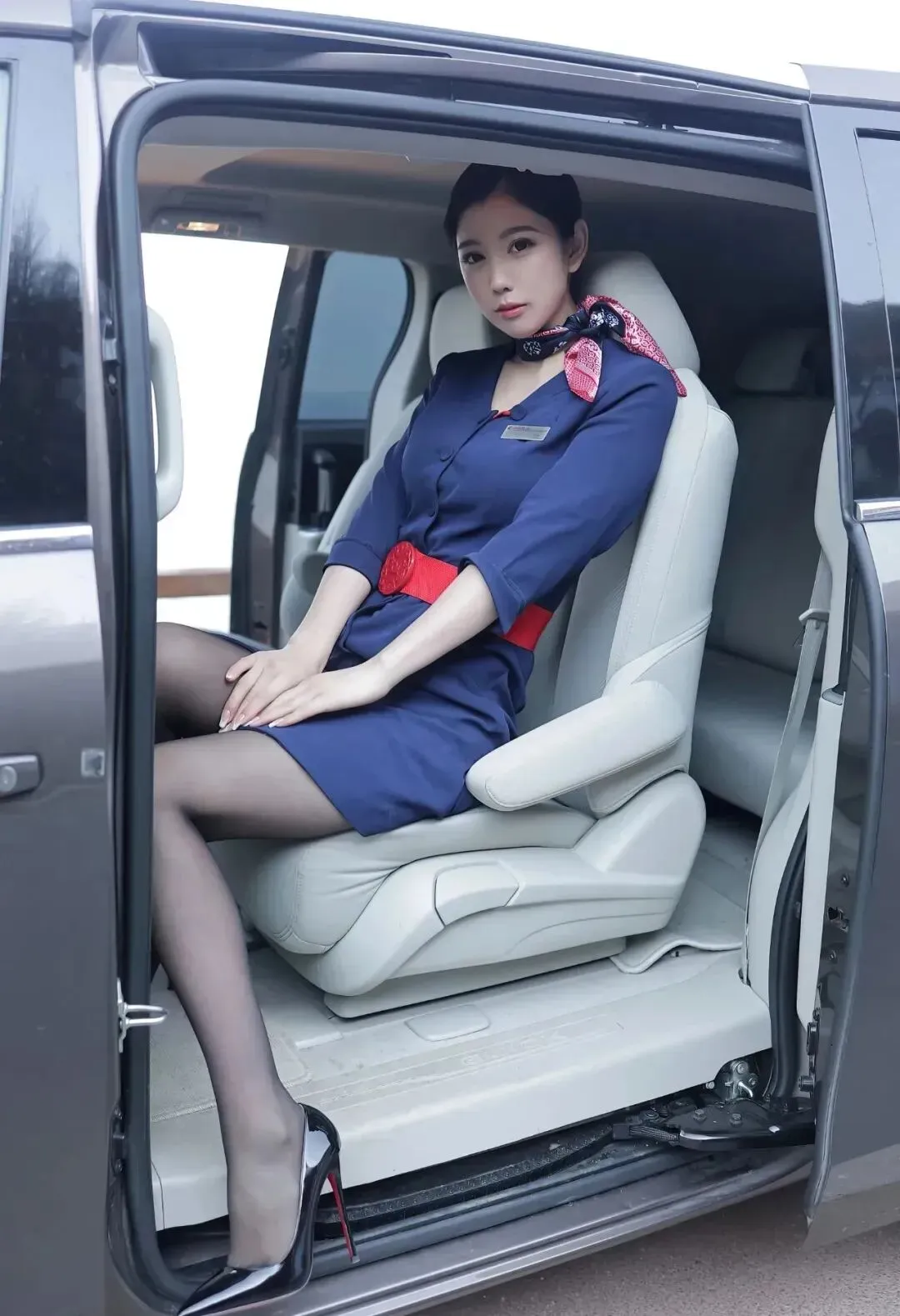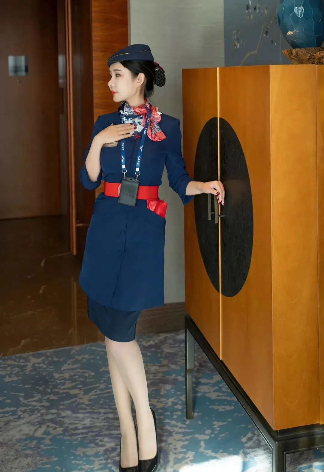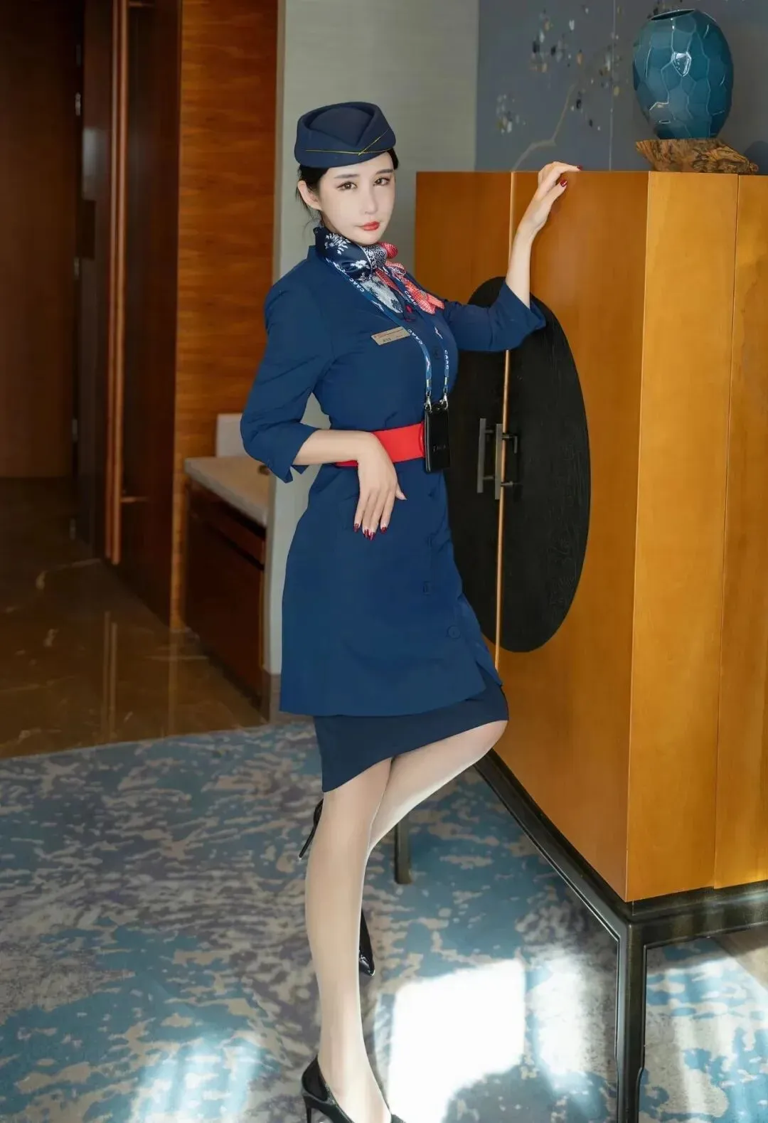 蓝色连衣裙,搭配红色腰带,配黑丝和黑色高跟鞋,这套空姐装非常惊艳,优雅端庄,令人着迷。
