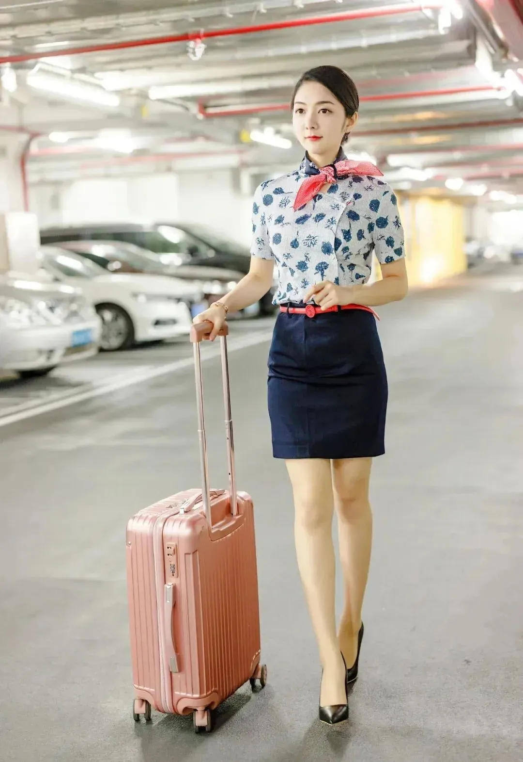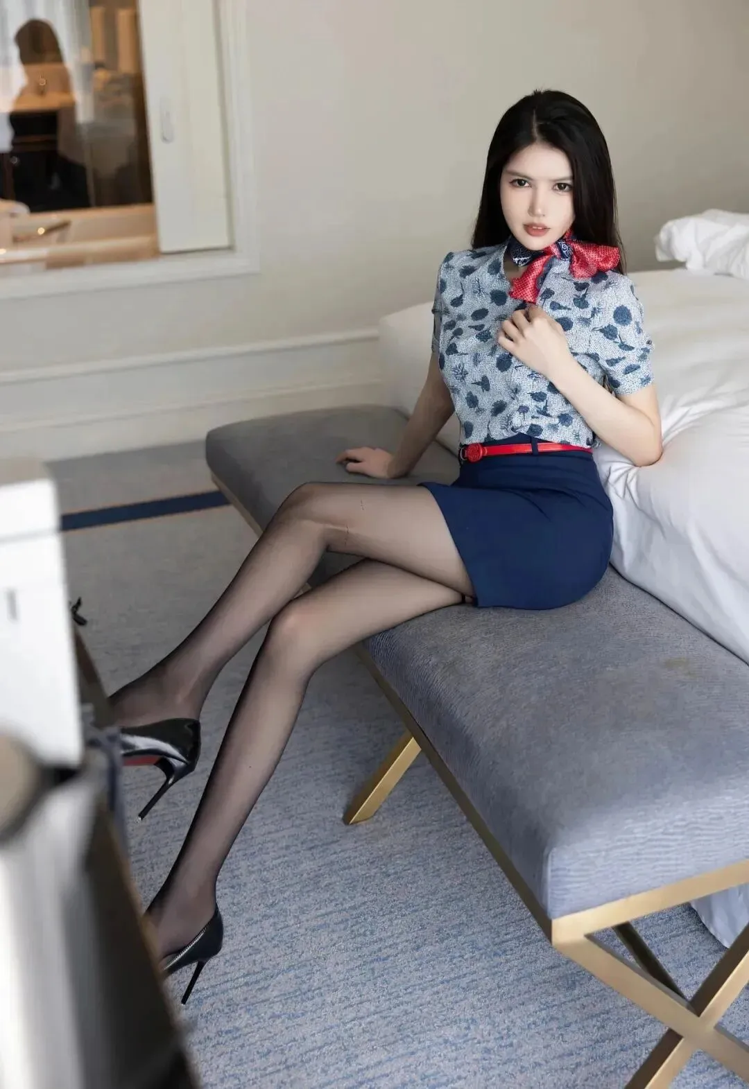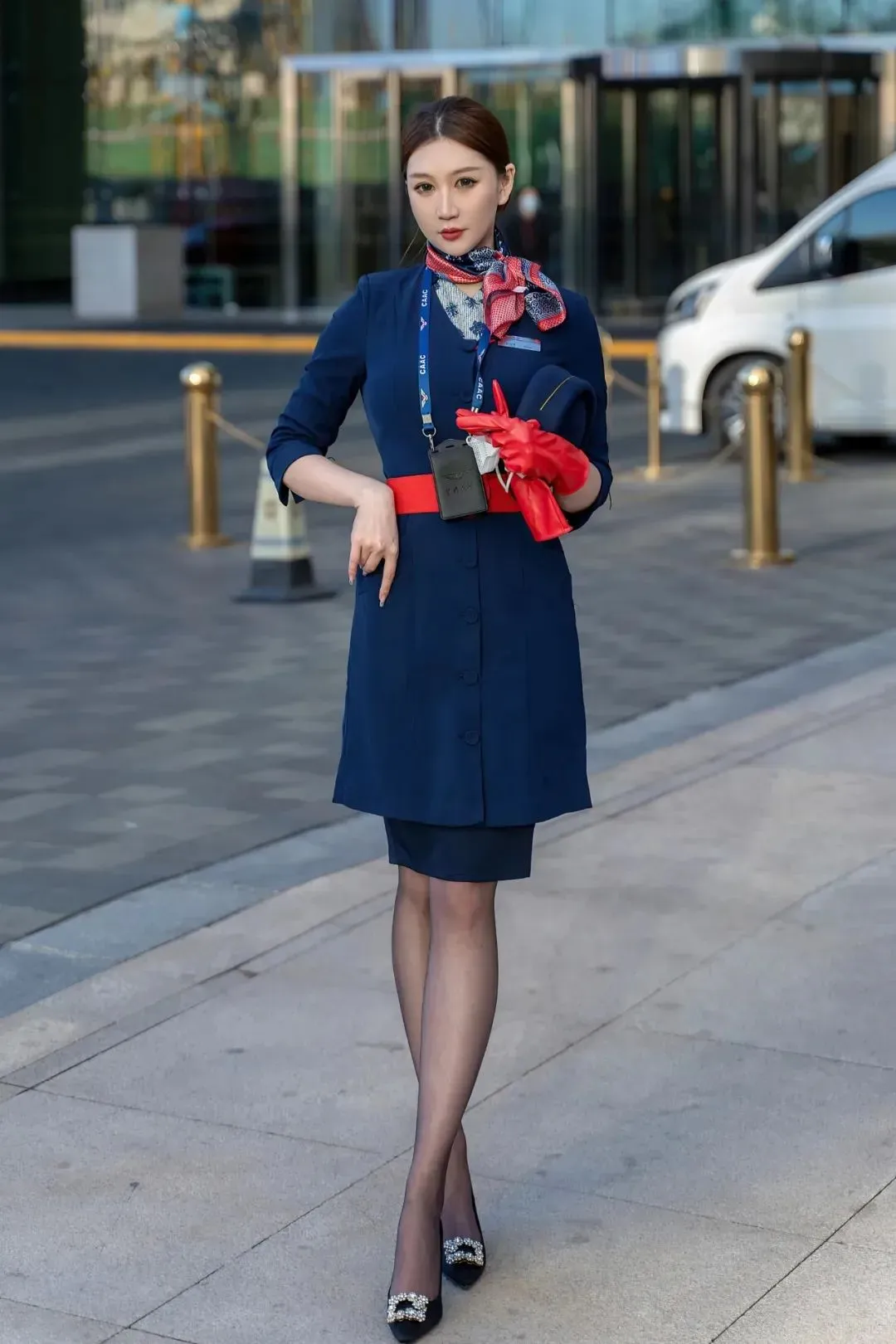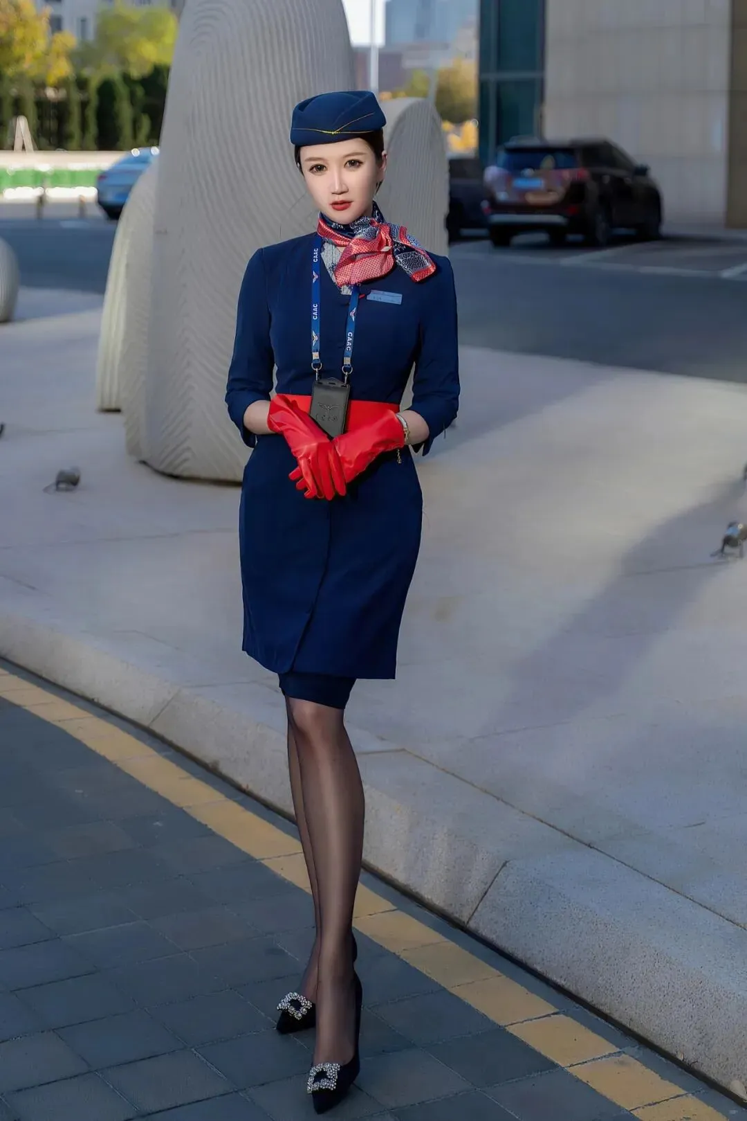 蓝色连衣裙,搭配红色腰带,配黑丝和黑色高跟鞋,这套空姐装非常惊艳,优雅端庄,令人着迷。