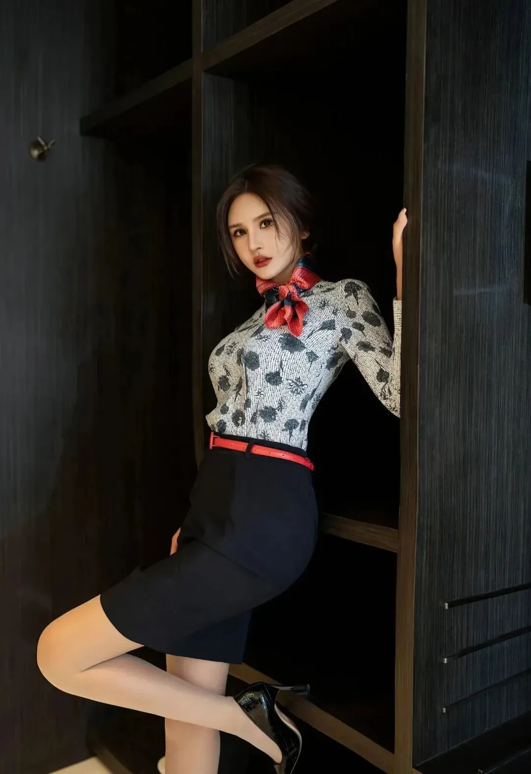 经典的空间制服套装,搭配黑丝和黑色红底高跟鞋,这是整套穿搭的点睛之笔,她身上有一股妩媚的气息,非常勾人。