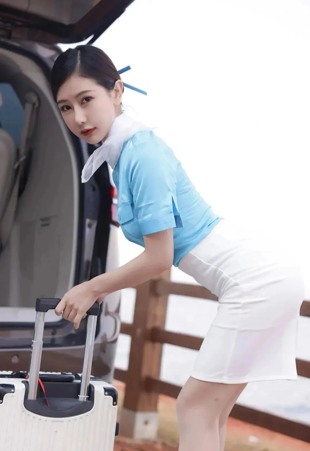 蓝色衬衫,搭配白色半身裙,配肉色丝袜和裸色高跟鞋,这一身韩国空姐制服造型,每一个造型,都能展现出她迷人的魅力。
