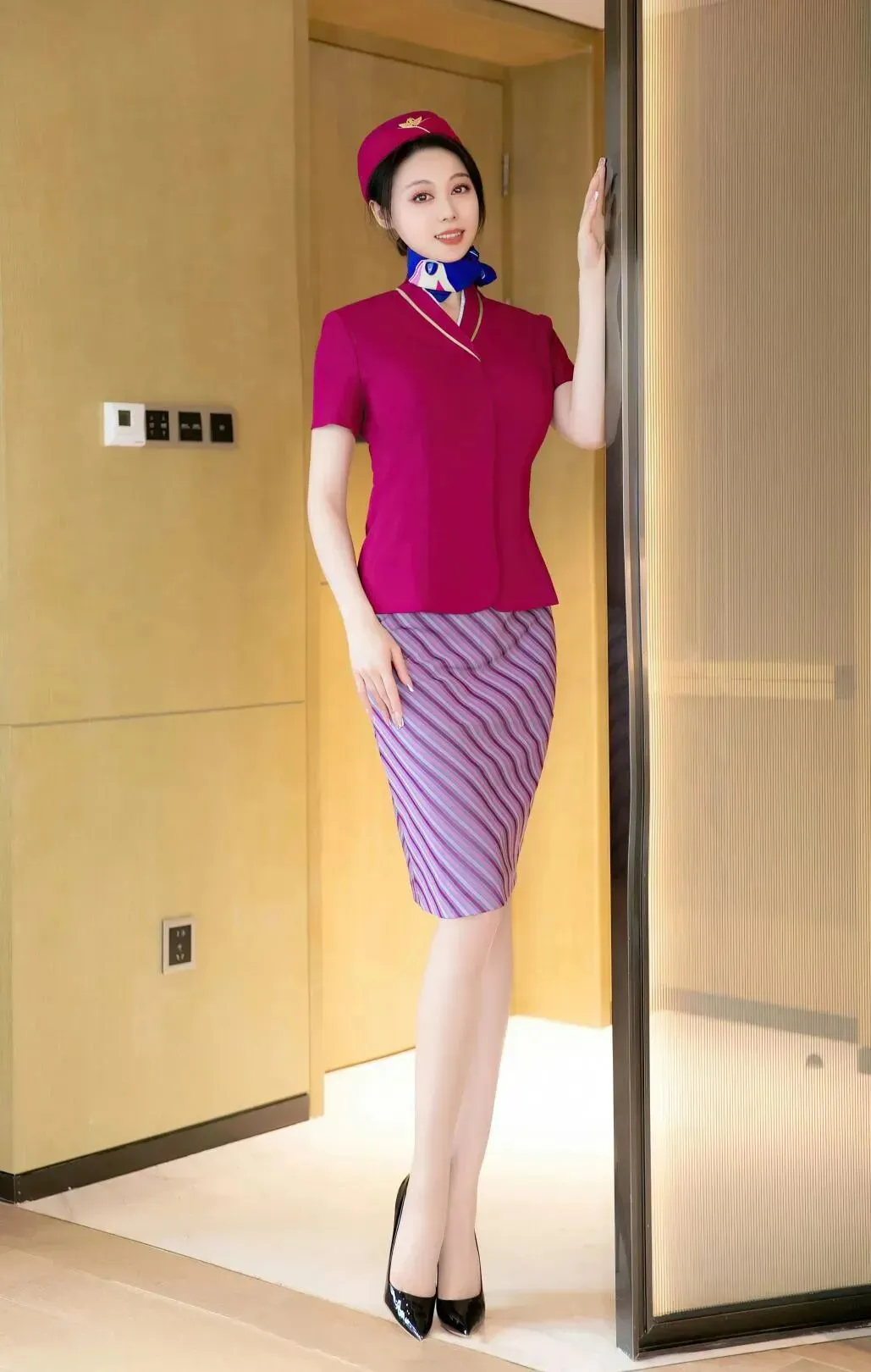 藏蓝色空姐制服套装,搭配黑丝和黑色高跟鞋,论穿搭,还得是空姐装有气质,更有韵味