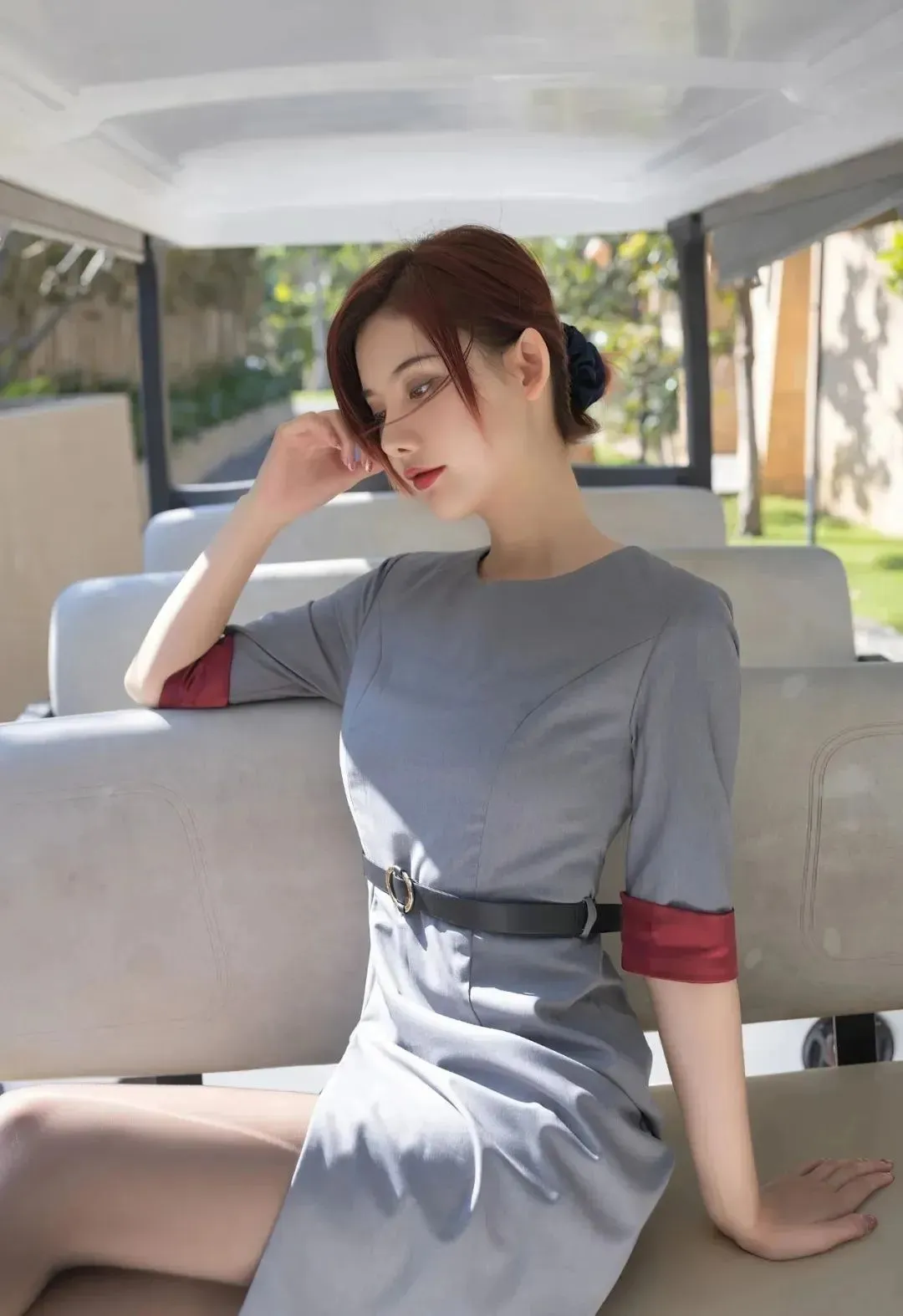 灰色马甲,内搭白色衬衫,下搭一条灰色超短裙,配肉色丝袜和黑色红底高跟鞋,杨晨晨的空姐制服造型,妩媚多姿,气质诱人。