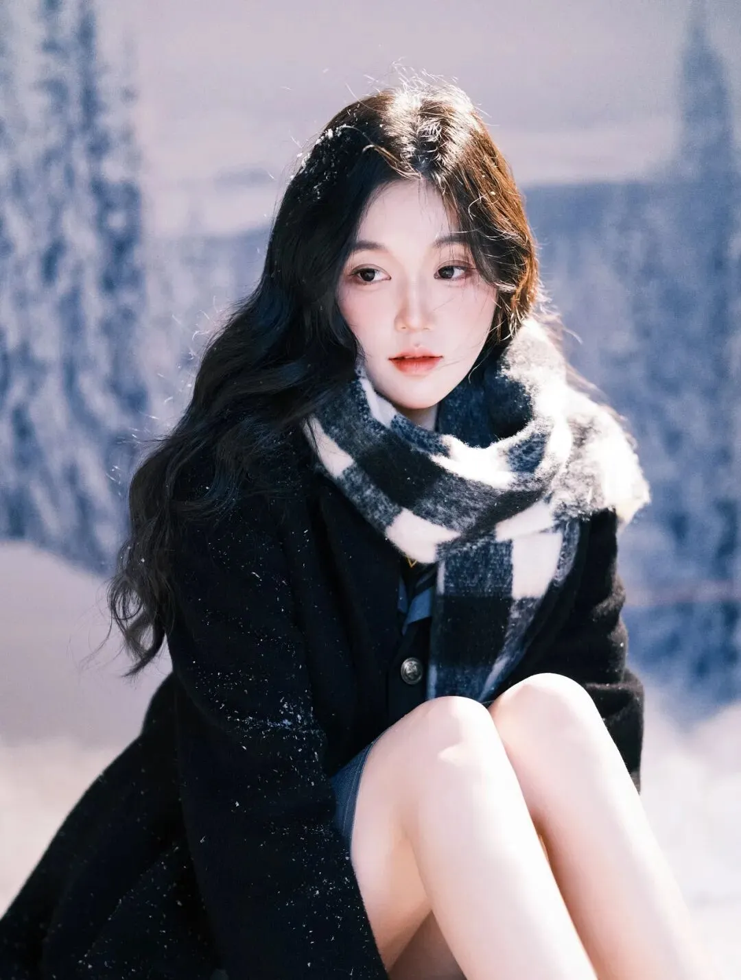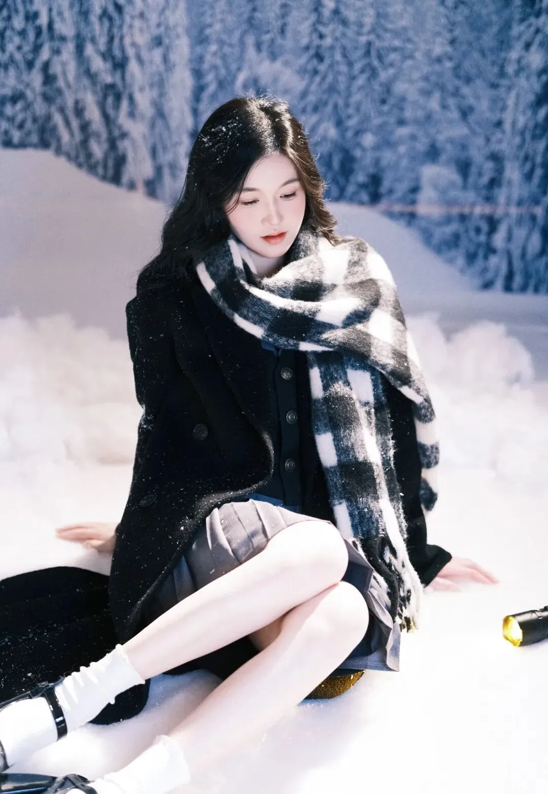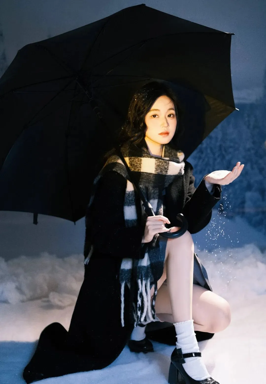 雪,是冬日的精灵,在寂静的夜晚悄然飘落,为世界披上一层洁白的纱衣。在这银装素裹的世界里,一位女子手持黑伞,宛如从梦幻中走来,构成了一幅如诗如画的美景。她身着一袭黑色长款大衣,沉稳而优雅,仿佛是冬日里的暗夜守护者。大衣的质感挺括,线条流畅,衬托出她修长的身姿。脖子上围着一条黑白格子围巾,经典的花色为整体造型增添了一份复古与时尚的气息。围巾的流苏随风轻轻摆动,似在诉说着冬日的低语。她跪坐在雪地上,双腿纤细白皙,穿着白色堆堆袜和黑色玛丽珍鞋,俏皮中又带着一丝优雅,仿佛是从旧时光中走出的少女。