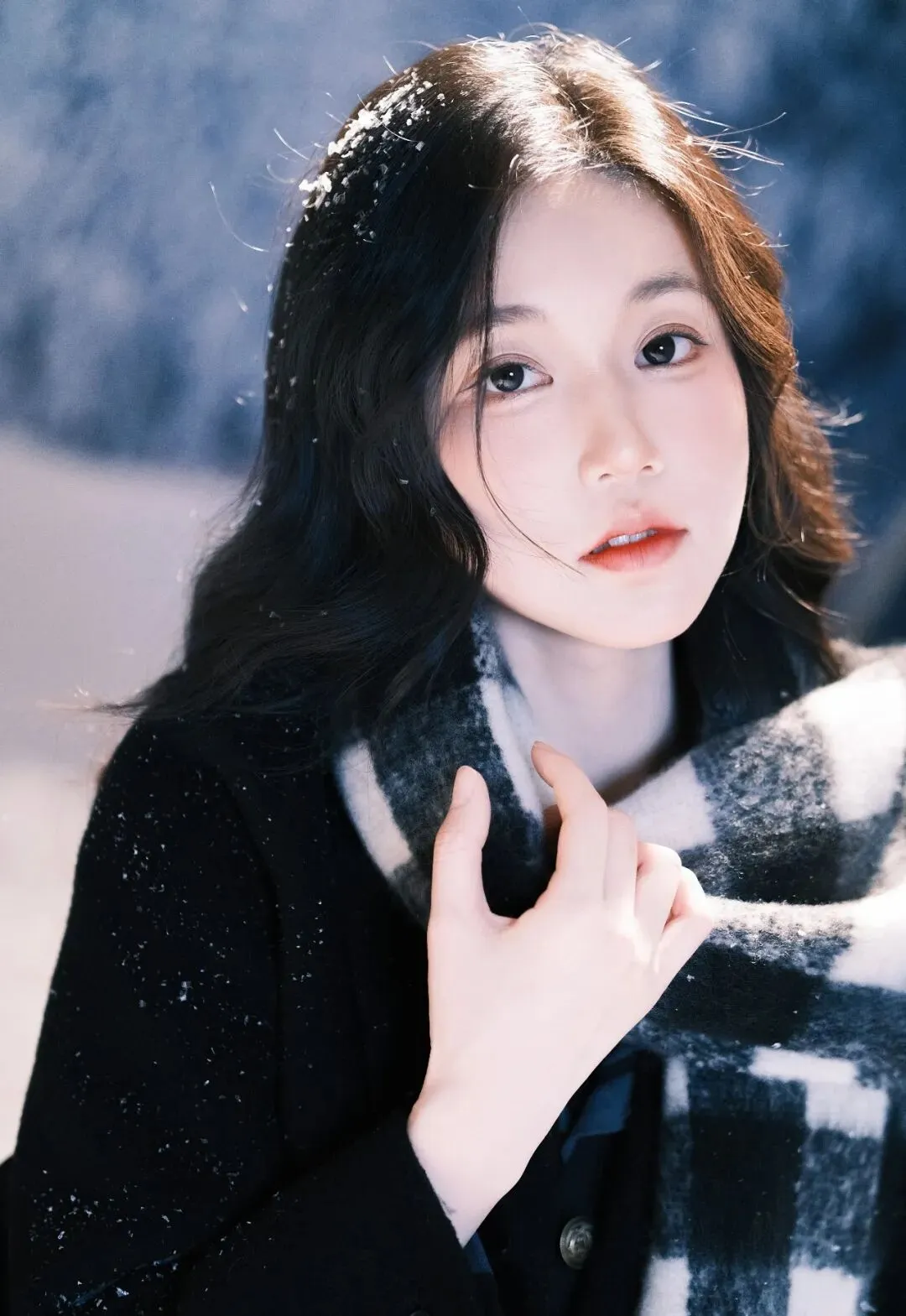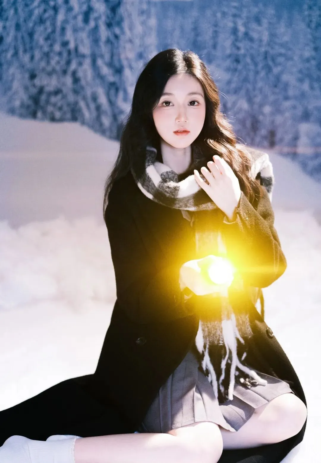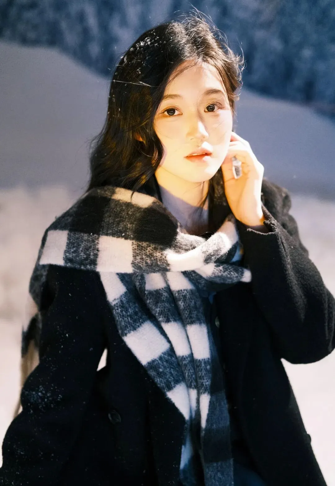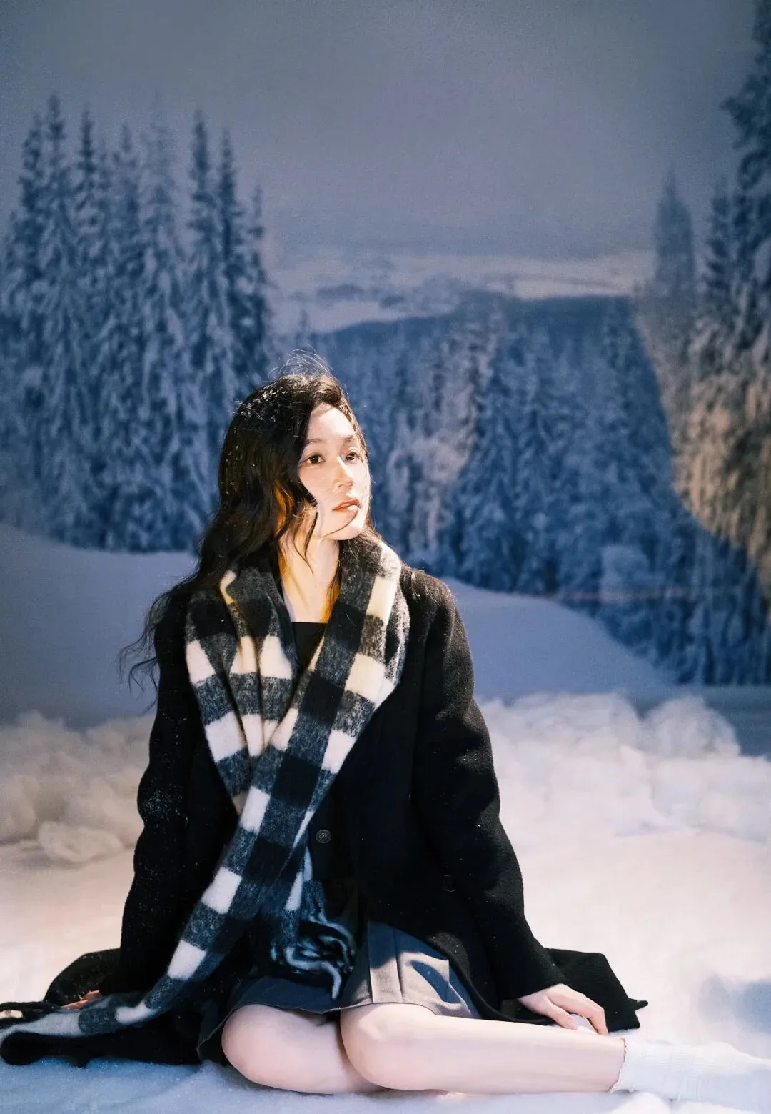 雪,是冬日的精灵,在寂静的夜晚悄然飘落,为世界披上一层洁白的纱衣。在这银装素裹的世界里,一位女子手持黑伞,宛如从梦幻中走来,构成了一幅如诗如画的美景。她身着一袭黑色长款大衣,沉稳而优雅,仿佛是冬日里的暗夜守护者。大衣的质感挺括,线条流畅,衬托出她修长的身姿。脖子上围着一条黑白格子围巾,经典的花色为整体造型增添了一份复古与时尚的气息。围巾的流苏随风轻轻摆动,似在诉说着冬日的低语。她跪坐在雪地上,双腿纤细白皙,穿着白色堆堆袜和黑色玛丽珍鞋,俏皮中又带着一丝优雅,仿佛是从旧时光中走出的少女。