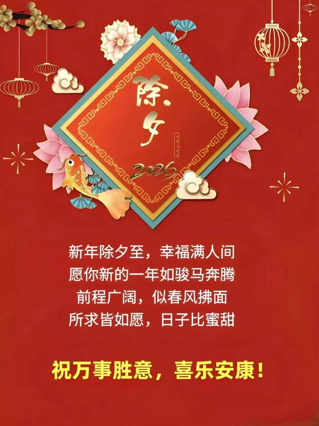 🧨🎉烟花灿,笑脸甜,是除夕之美;贴春联,挂红灯,是除夕之颜;磕喜头,拜大年,是除夕之形;庆团圆,合家欢,是除夕之乐;祝吉祥,盼平安,是除夕之愿!🎈🌺🎉