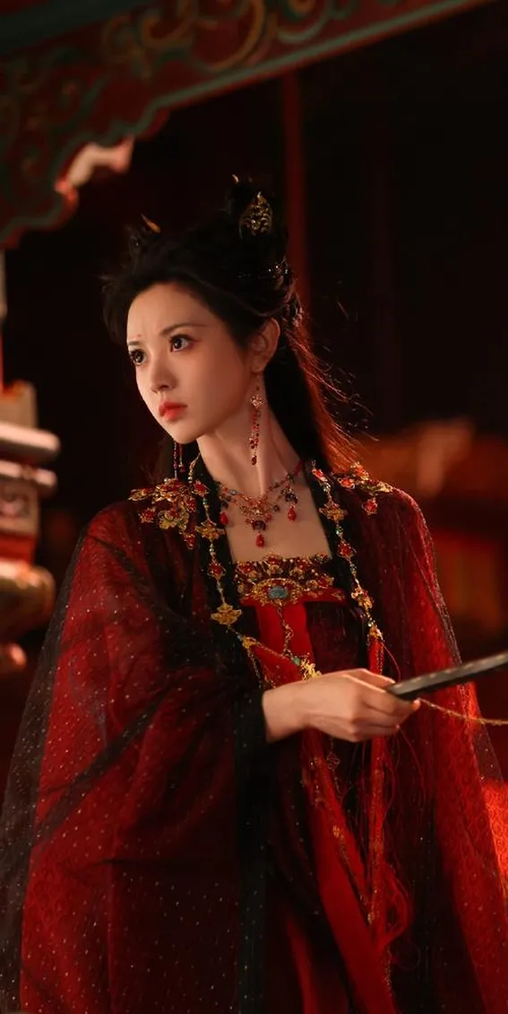 胭脂浓烈,红衣似火,她收起所有惯有的娇憨笑意,眼神沉静如古井,看向镜头时甚至带着一丝疏离的倨傲。