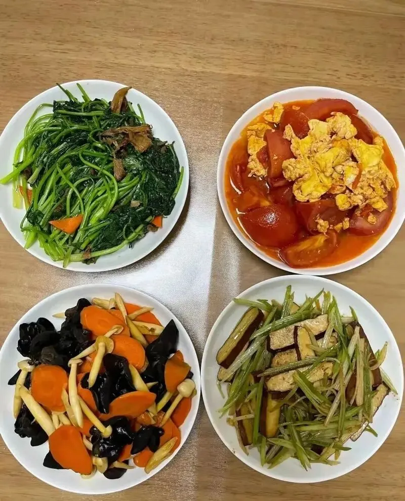 她已经吃素很多年了,所以她的饭菜里,看不到任何肉类,全是各种素食。
