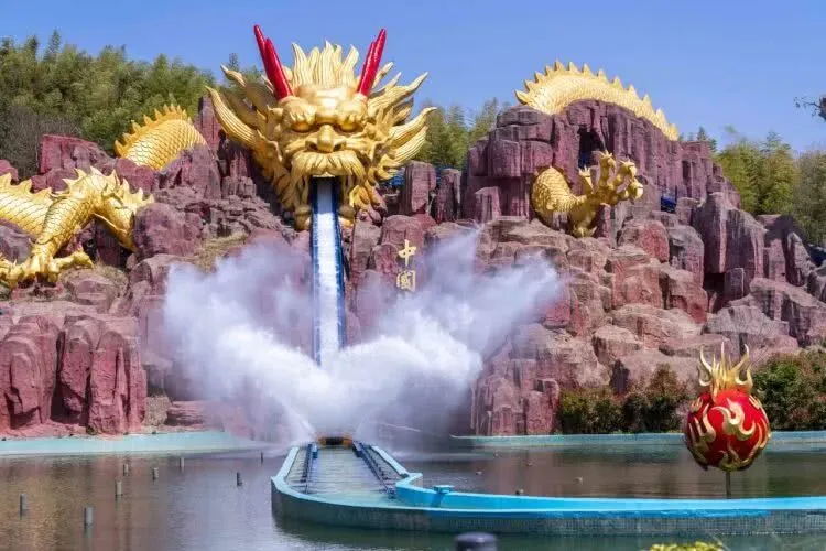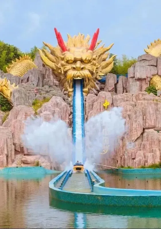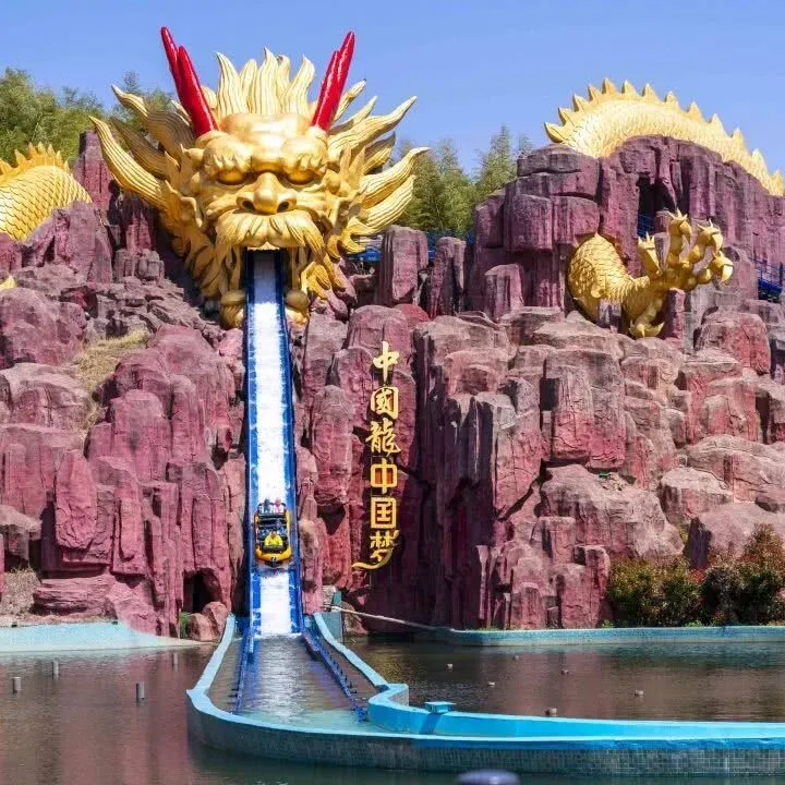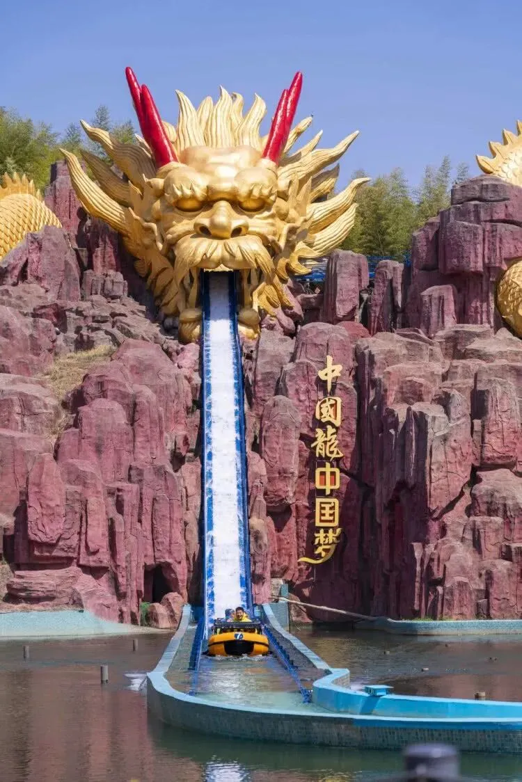 全高的30米的中国龙·中国梦(大冲刺)是标志性建筑,寓意深长,外形是威武的龙形,盘踞在石头山上,穿梭其间的是顺着水道下滑的船,玩法和激流勇进差不多,就是刺激度和震撼力更强些。