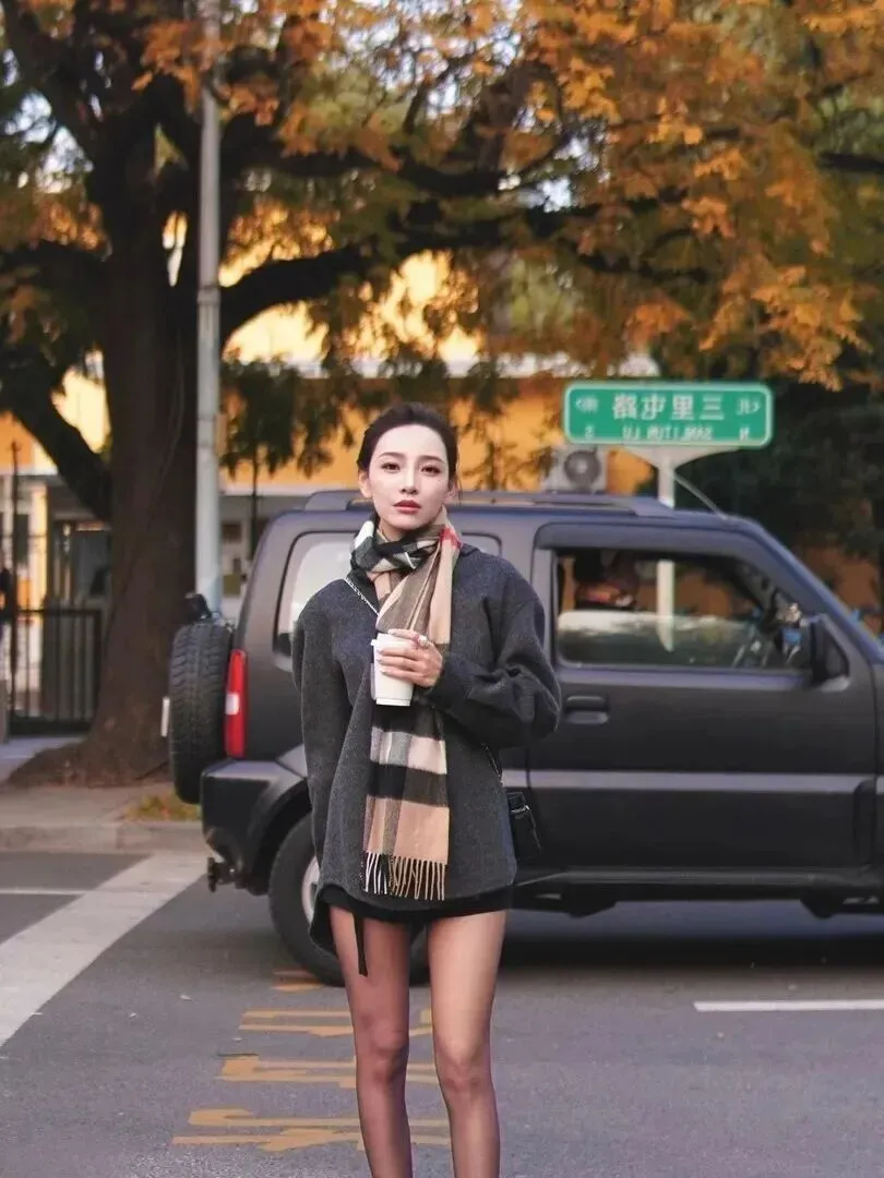 秋天少不.了氛.围感穿搭。.格纹和.毛衣是绝配.。深灰色.卫衣加上.经典格.纹围巾,基.础款.立刻不普通.。短.黑裙和.肉色丝.袜添.点小.性感.,斜挎个.小黑包,.细节精致。.秋叶飘.下来.的时.候,.穿这一身.出门,.氛围感直接.爆棚。