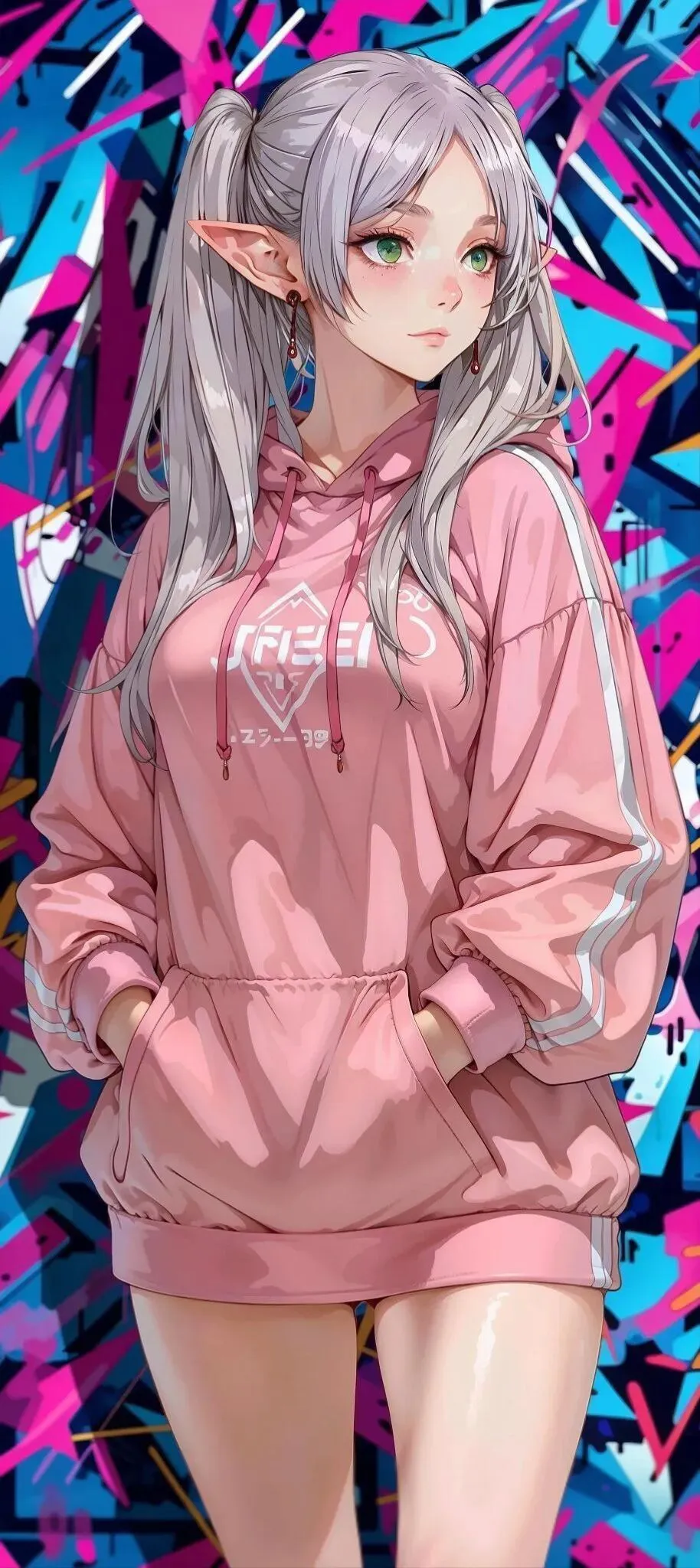 《葬送的芙莉莲》中的芙莉莲,标志性的银灰双马尾与翠绿眼眸,充满了清冷灵动的气息。粉色连帽卫衣的搭配,将她作为千年精灵魔法使的强大力量藏在休闲外表之下,双手插兜时的神情里透露出的疏离,让人忍不住探寻她漫长生命里的温柔与孤独。