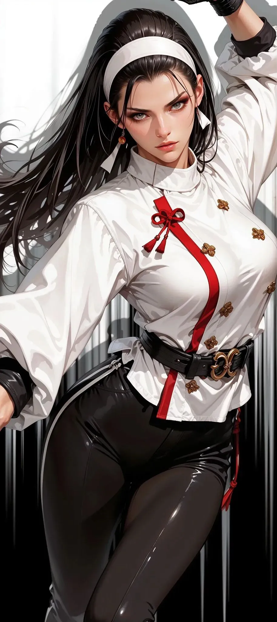 《拳皇》中的神乐千鹤,标志性的乌黑长发与素白发带,充满了沉稳凛然的气场。改良传统服饰的搭配,将她作为八咫镜继承者的强大力量藏在端庄外表之下,起势时的身姿里透露出的坚定,让人忍不住敬畏她守护封印的决心。