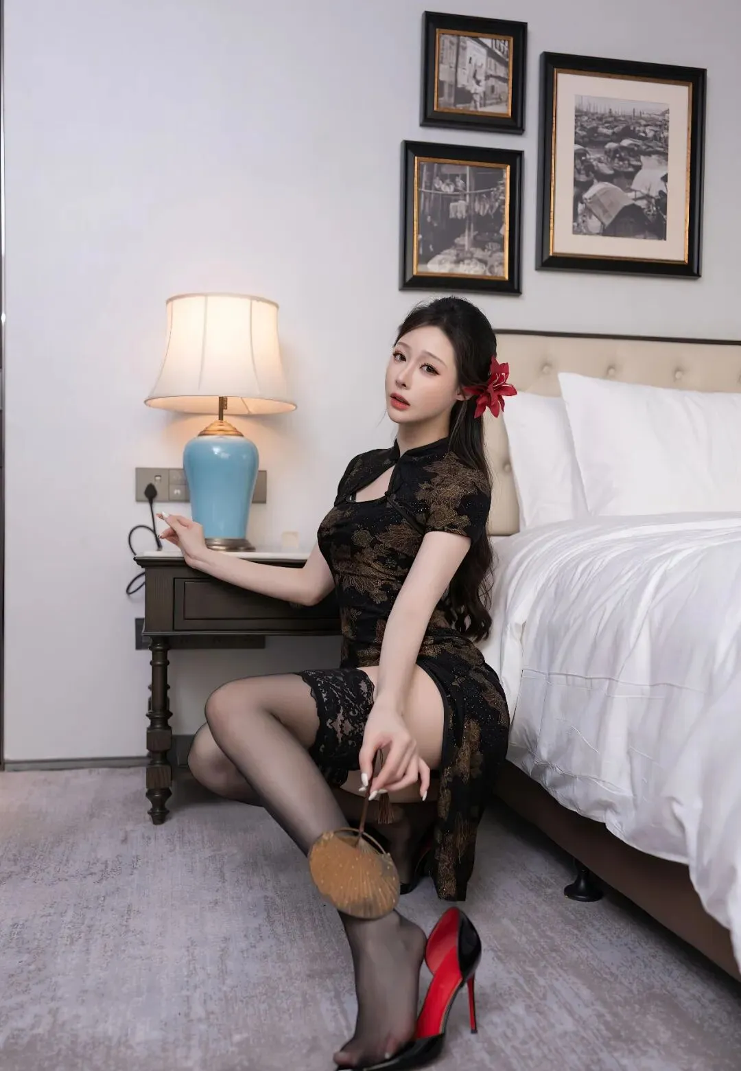 超薄黑丝修饰腿部线条,与蕾丝镂空呼应,增添朦胧性感;红底细高跟点亮全身,与黑金旗袍形成撞色,打破黑金的厚重,成为视觉焦点;发间红簪花点缀,与红底鞋呼应,为复古造型注入明艳感,贵气又灵动。