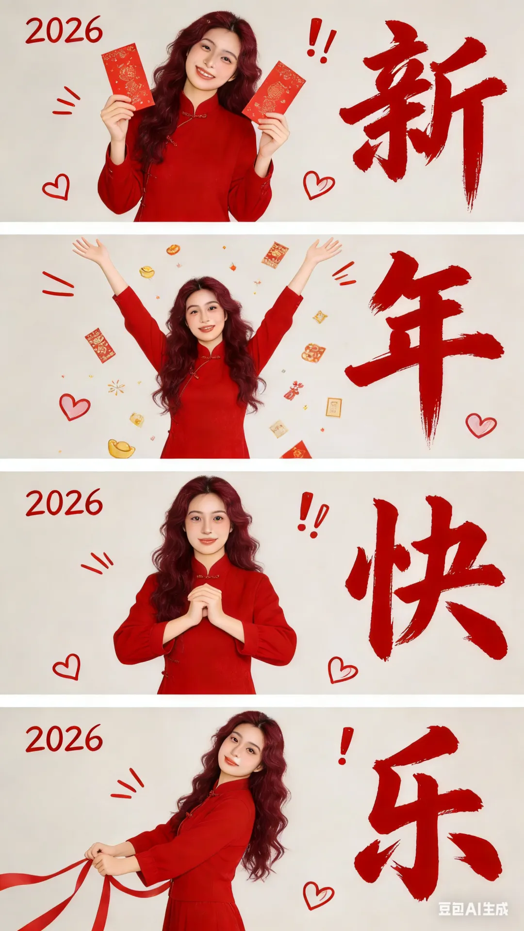 一张上下四宫格拼接的新年主题写真照,保留原图主体不变,主体身穿红色中式服装,从上到下画面依次为: