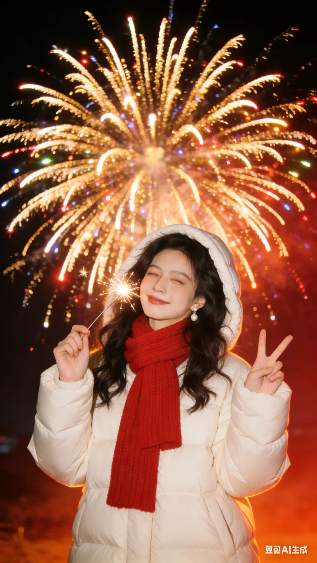 漆黑的夜空中绽放着巨大的金色和彩色烟花,烟火占据了大部分背景。绚烂的火光在人物四周投射出温暖的橙红色光晕,背景略微虚化,充满节日的喜庆氛围。
