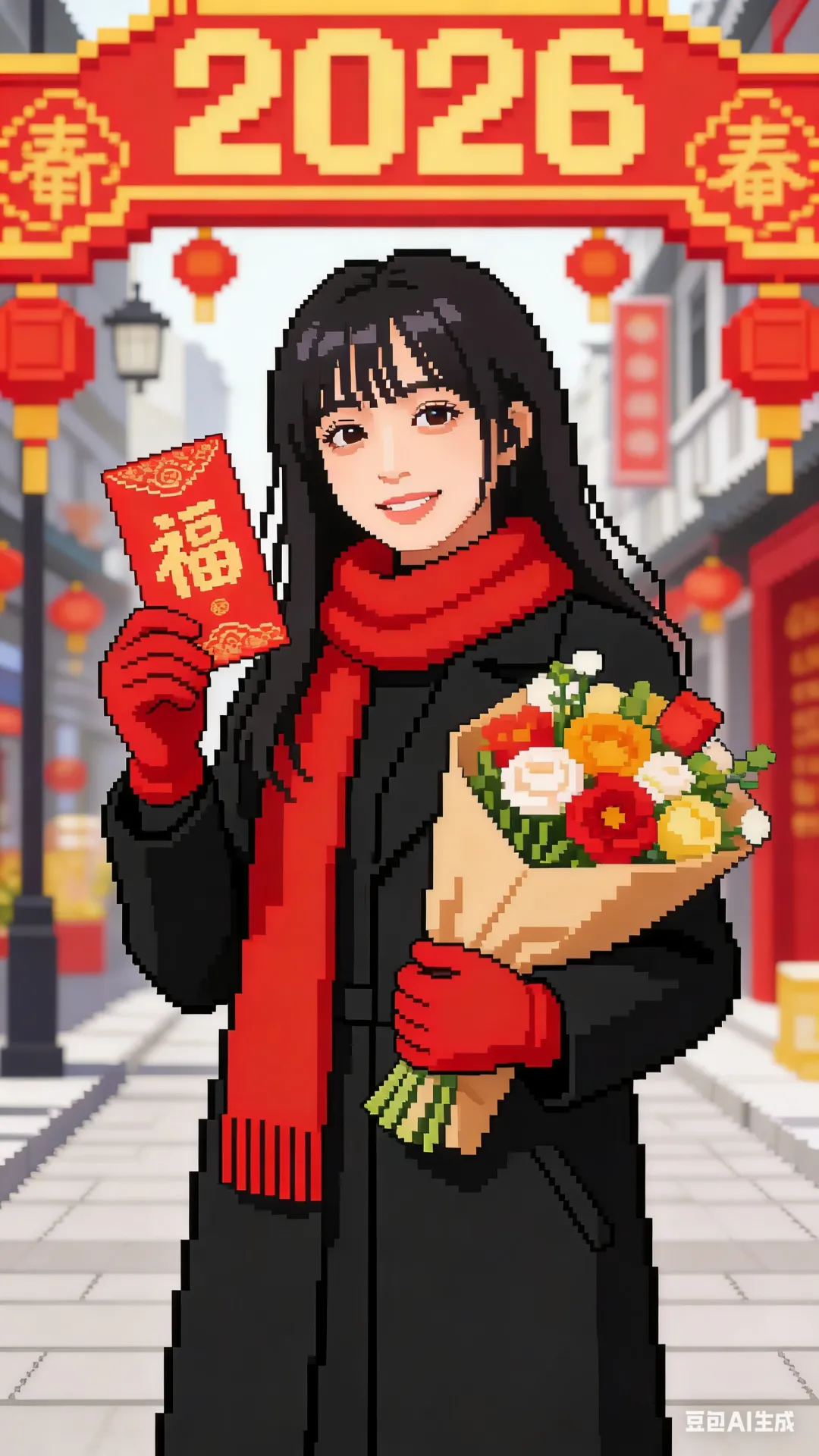 保持图中主体不变,变成像素风格,主体身穿黑色长款外套+红色围巾+红色手套,新春街道背景,主体站姿一手持“福”字红包、一手抱花束,微笑看向镜头,画面喜庆温馨且具高级感。
