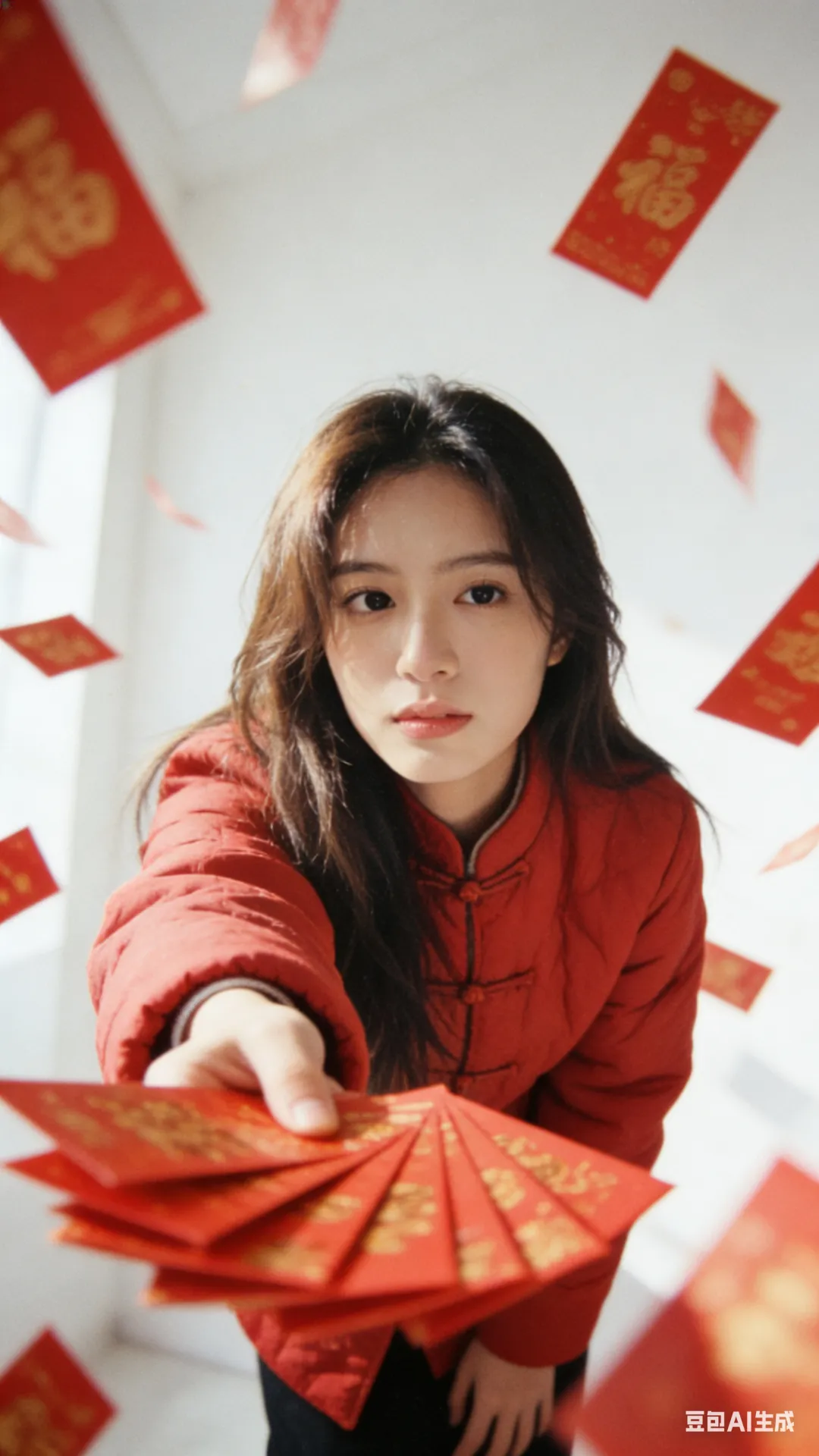 使用鱼眼广角视角近距离拍摄,主体占据画面中心。主体身穿红色新中式改良棉服,画面满屏正红 + 暖棕 + 金色配色,主体前倾递一叠红包,四周动态飘洒红包,背景是白色墙壁并做虚化处理。采用柔和侧前方自然光,柯达金复古胶片质感,带轻微颗粒感,整体氛围喜庆元气,传递新春送福的吉祥氛围。