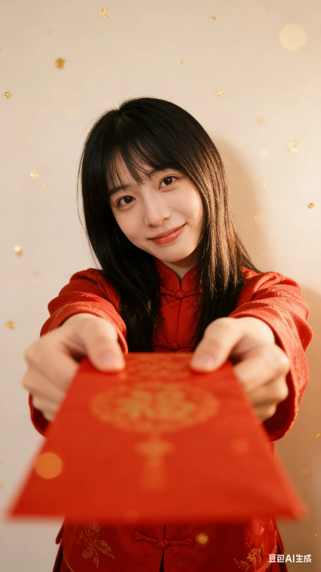 保留主体不变,穿红色拜年服,双手举大红包递向镜头,背景浅米纯色墙+零星金箔光斑,暖光柔化,高清写实,拜年氛围感拉满。