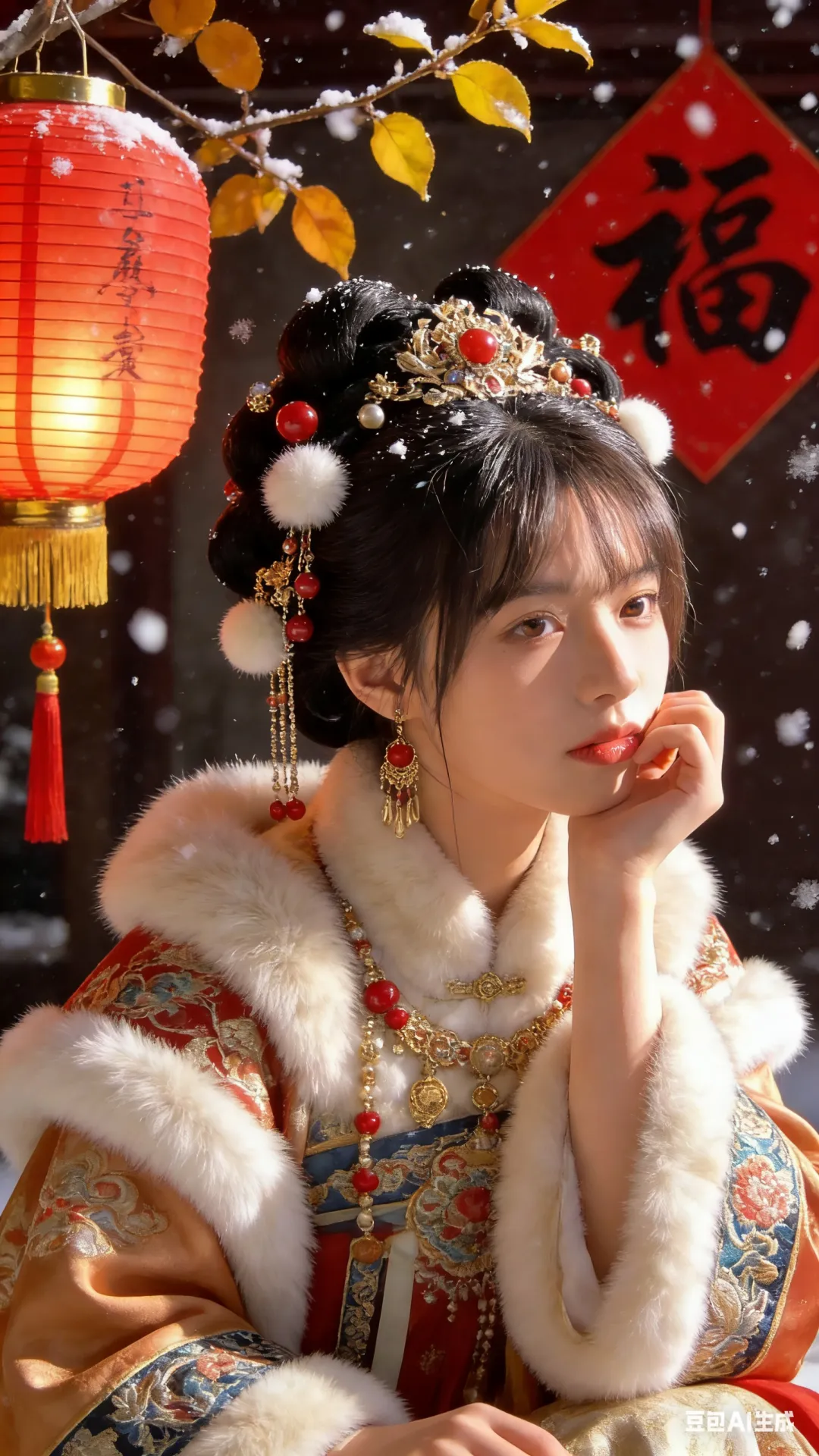 古风风格的人物摄影,画面色调温暖且富有节日氛围,采用中景拍摄。主体为身着带有毛绒装饰、绣有精美纹样的传统服饰的人物,人物梳着复杂发髻,佩戴有红珠、金饰、毛球等装饰的华丽头饰与耳饰。背景中有红色灯笼、写有文字的红色福字装饰、泛黄的枝叶,空中还飘落着雪花,整体营造出传统节日里温馨雅致的氛围。