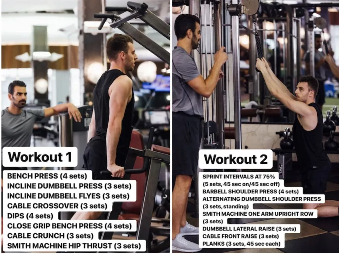 Spencer联系了Nlye,拿到了他的日常运动和饮食方案,Nyle每周有四天的时间健身,每次都会针对一个不同部位的肌群进行训练。