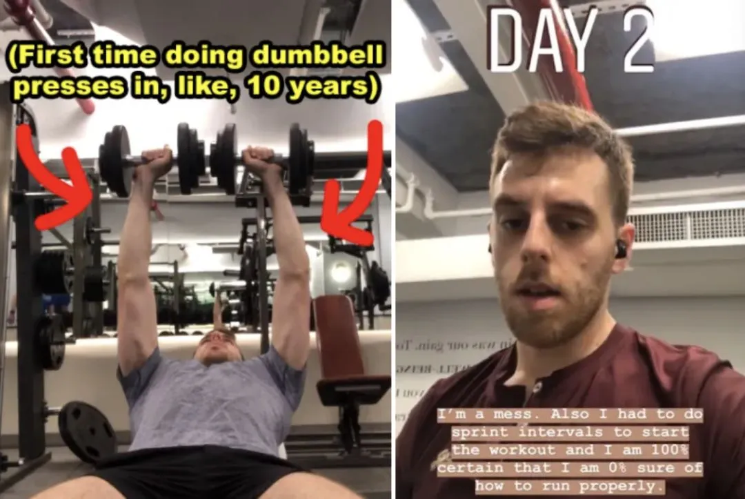 健身计划挑战的前几天对于Spencer来说简直度日如年,因为很多练习他以前从来都没有做过,不仅聚不起来多少重量,而且姿势也不标准,这让他感觉有点羞愧和颓废。