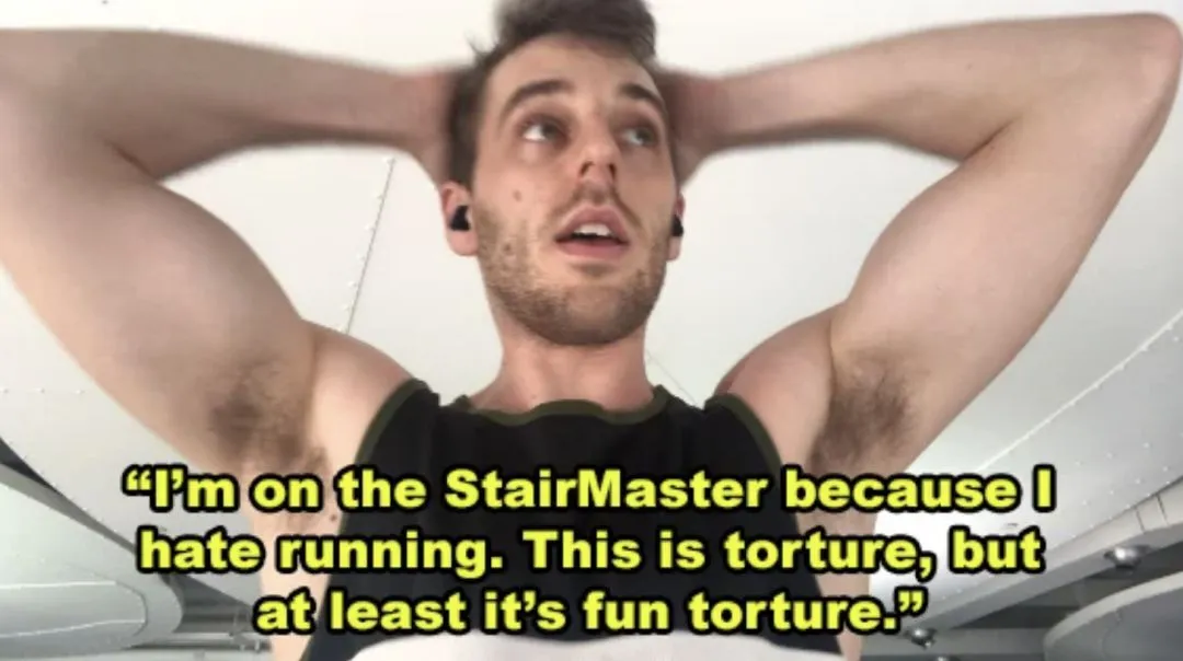 比如在Nyle跑步的时候,他选择了用登山机来代替慢跑,虽然这两者对他来说都是折磨,但是至少这种他更能接受一点……
