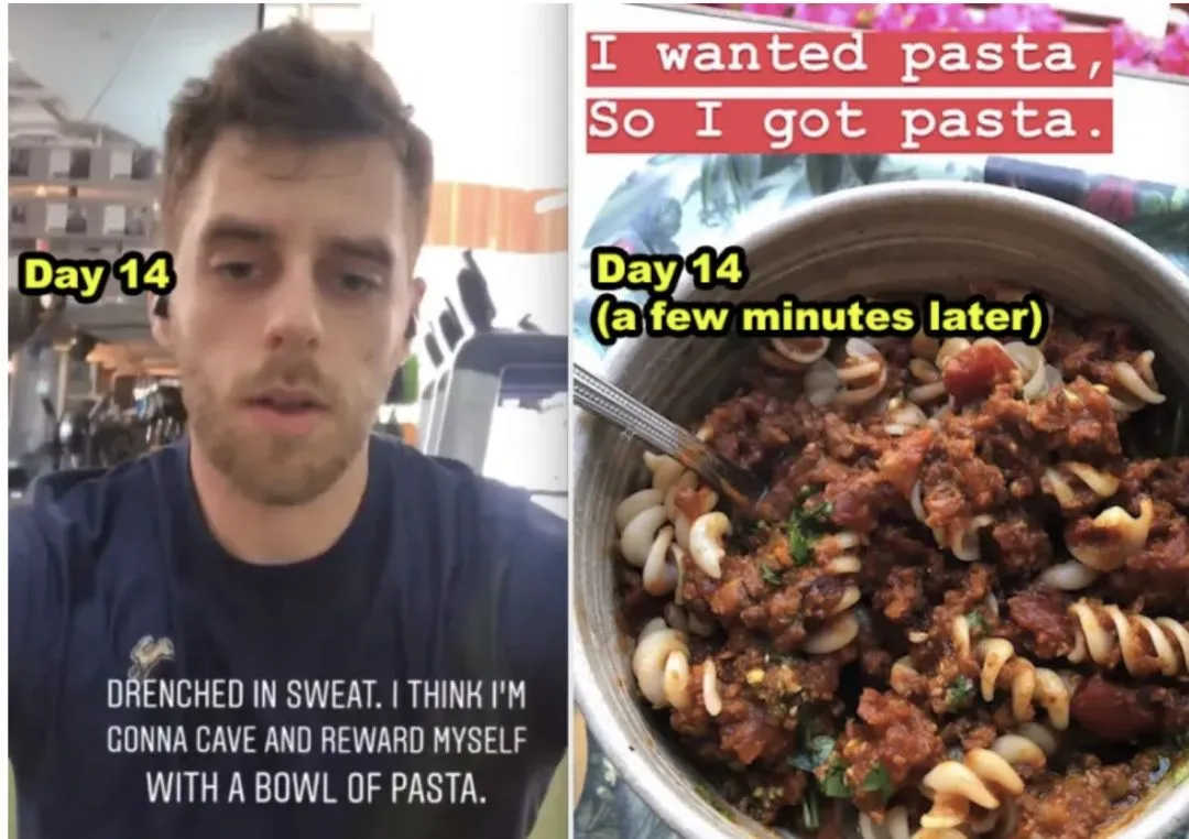 即便是像Nyle这样对自己的饮食有着严格要求的人,也不会克制自己偶尔对于食物的渴望,比如在第14天的时候,Spencer在运动之后,就奖励了自己一碗一直想吃的意大利面。