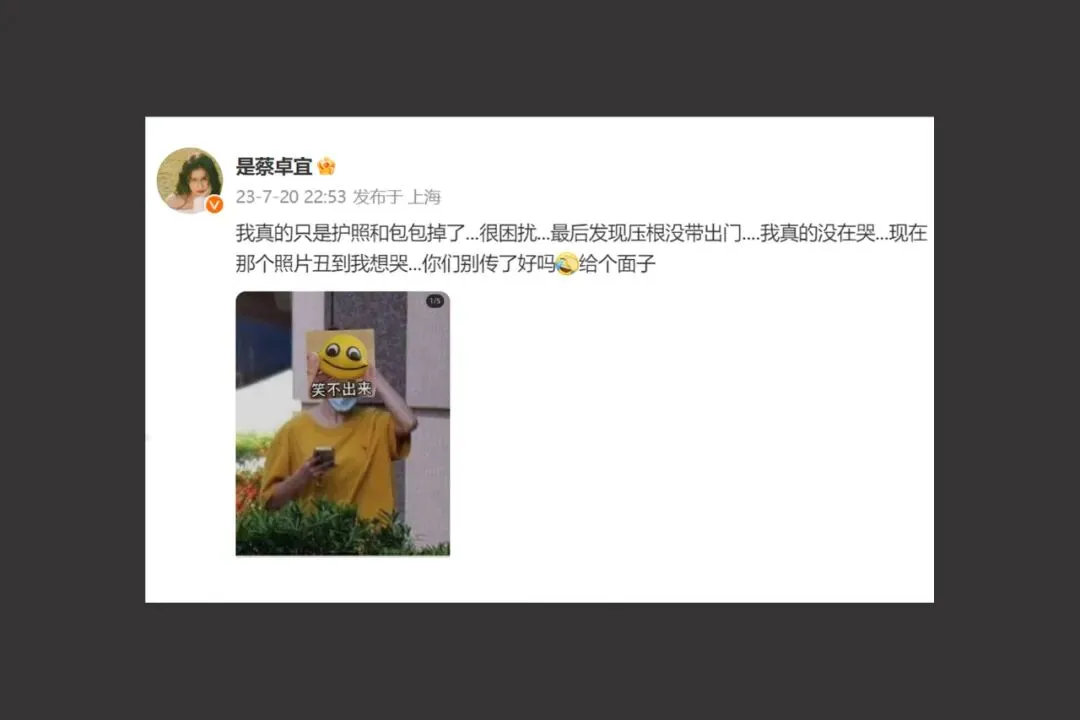 台媒之前拍到蔡卓宜摸头大哭,她解释说是自己以为护照和包包掉了👇