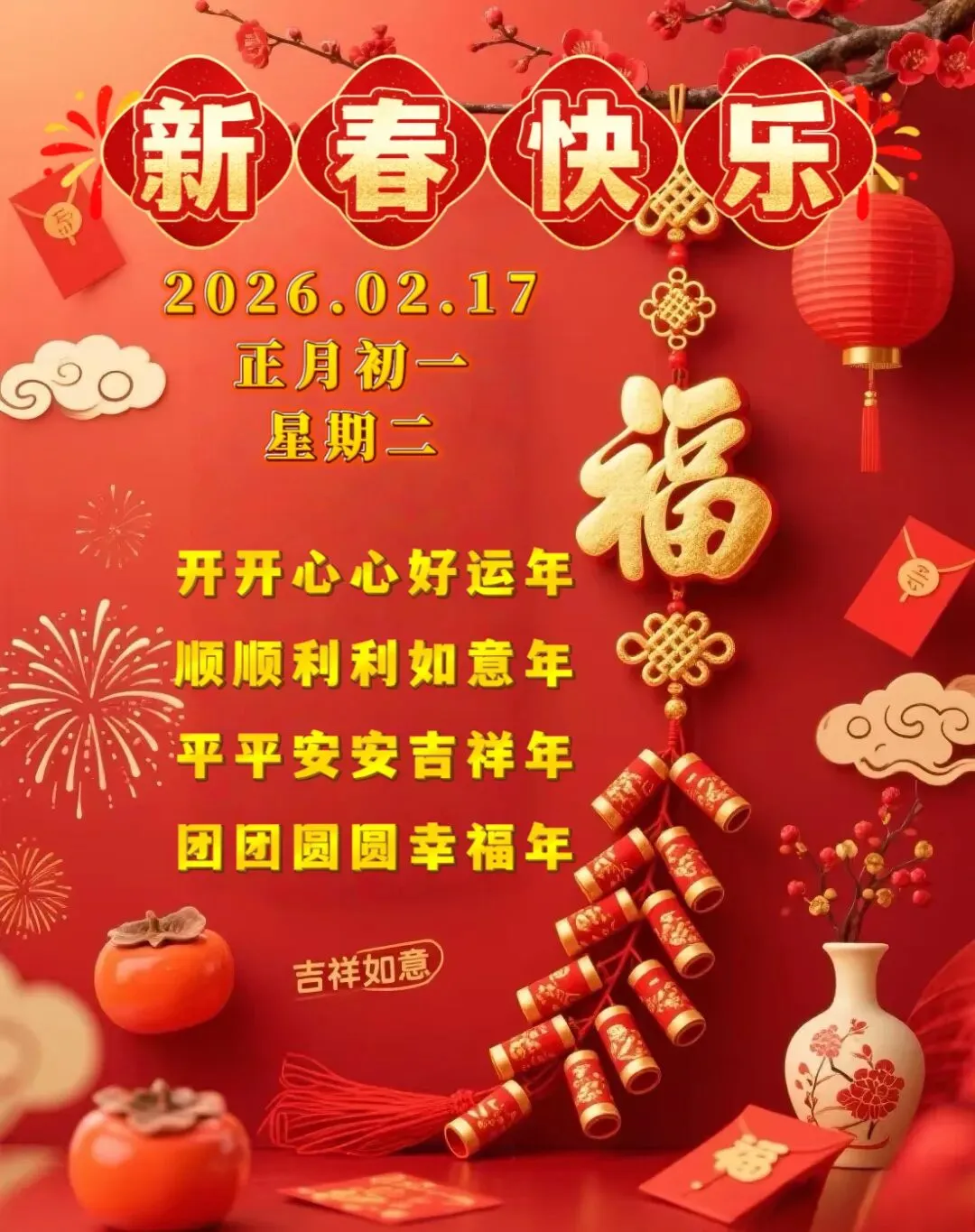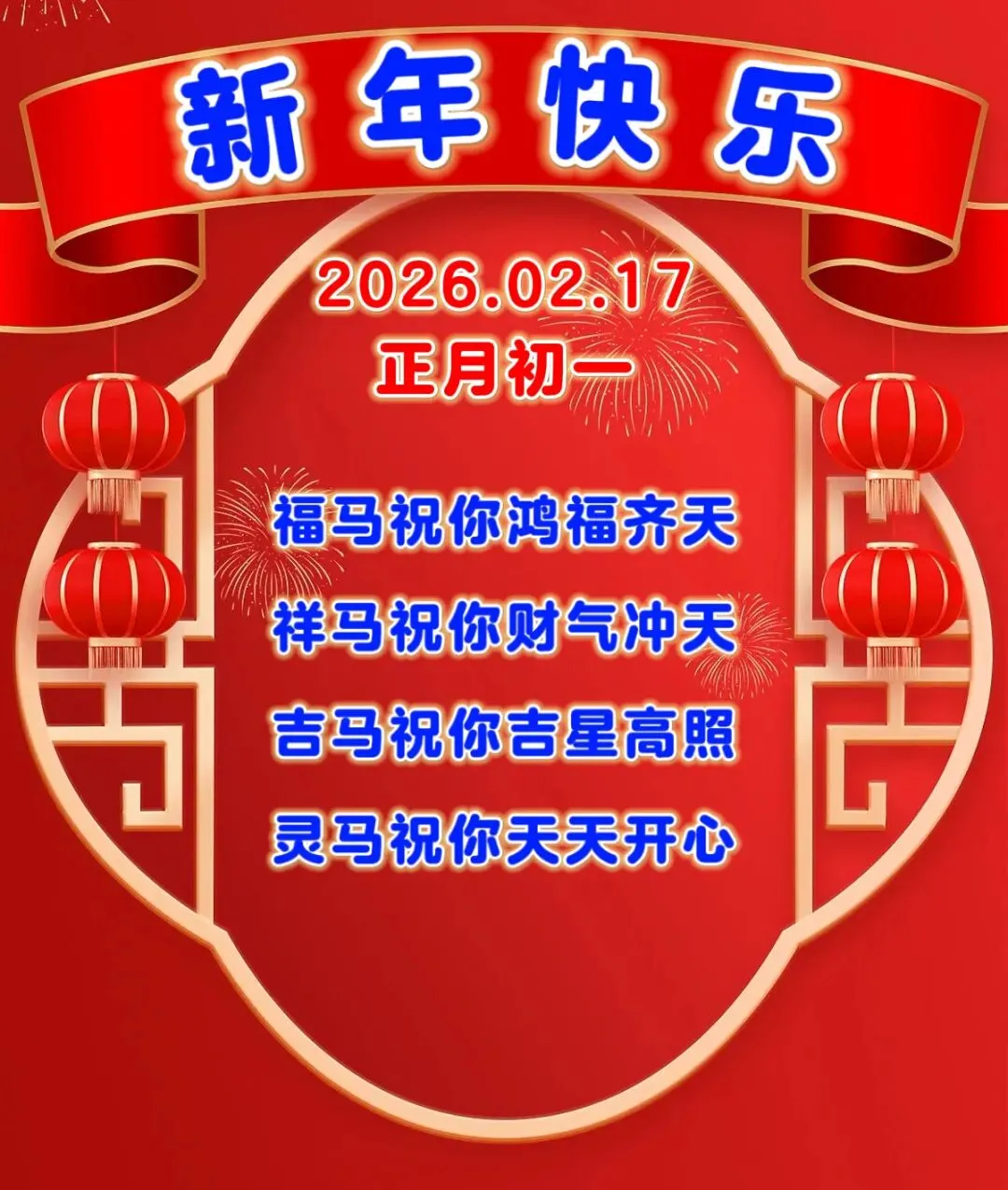 🌈今天是大年初一,迎新春,贺新年!🎉新年新岁人欢畅,年年有余兆吉祥!🌷新春大吉,恭贺新禧,🌞祝您新年快乐,好运相伴!🌻愿您生活幸福,万事如意!🌹2026马年大吉大利!新春快乐!🌅