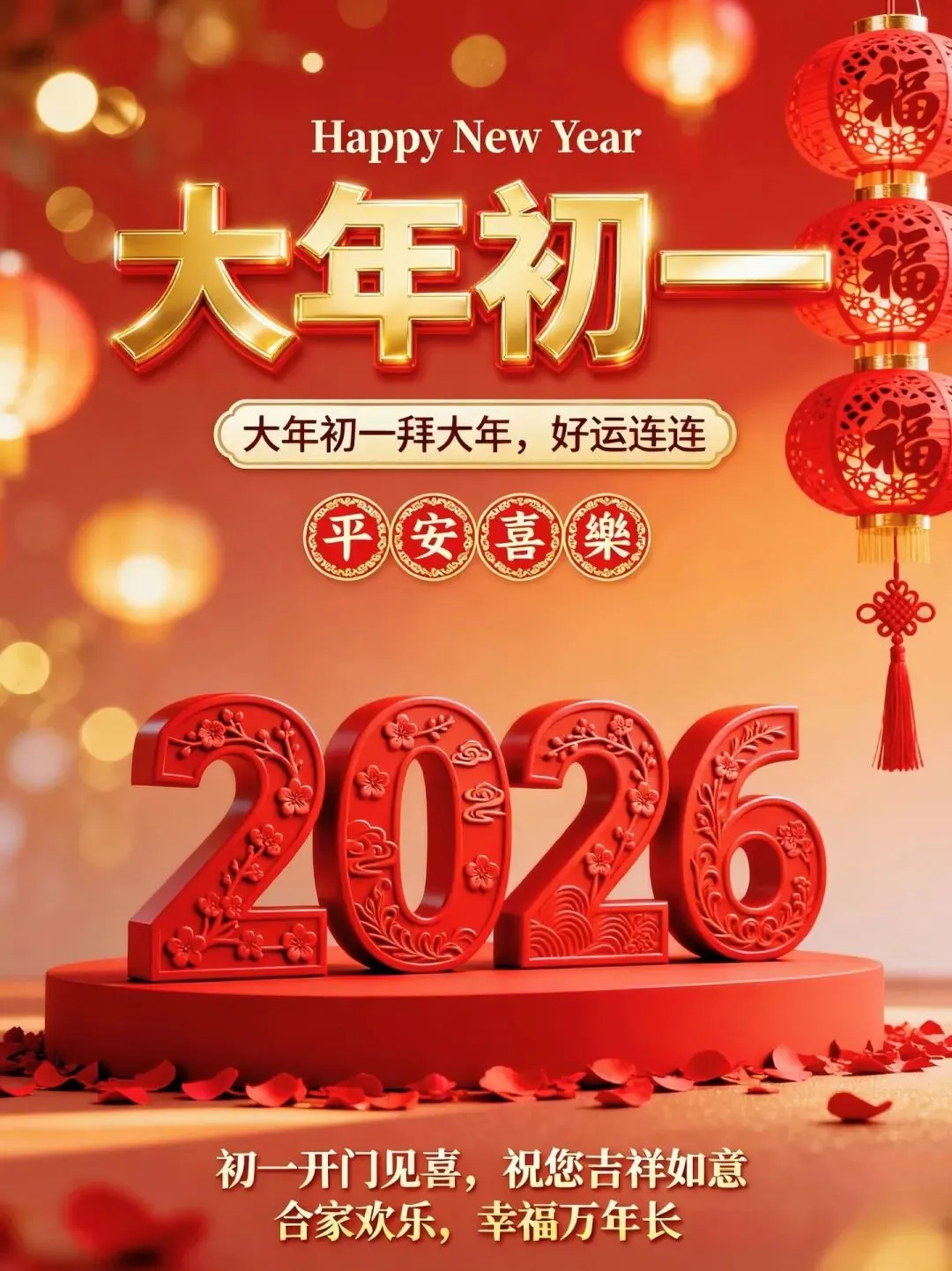 🌅金马贺岁迎新春,🌹大年初一拜大年,🌞祝你风风火火招财年,🌷顺顺利利如意年,💖开开心心好运年,🌻快快乐乐欢喜年,💕平平安安吉祥年,🎉团团圆圆幸福年!🌊祝您2026新年快乐~🌈