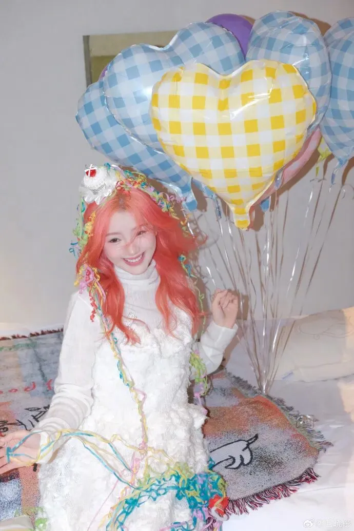 毛晓彤一头亮眼的粉发,搭配彩色丝带和气球,她做出嘟嘴wink、托腮笑等表情,这位女星的每个动作都带着明媚活力,美得让人窒息。
