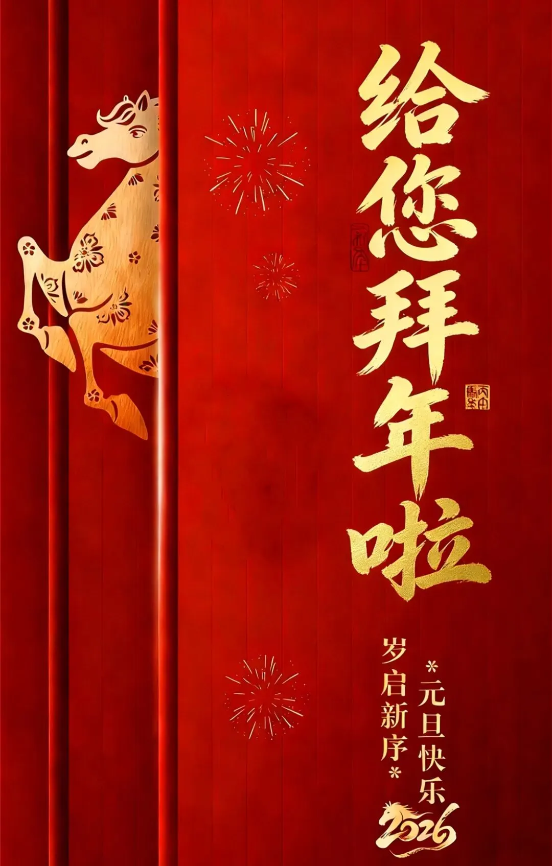 大年初一,给你拜年啦!骏马迎春,福临门庭!祝您岁岁长安康,年年皆顺意,新的一年,马年行大运,万事皆顺意!