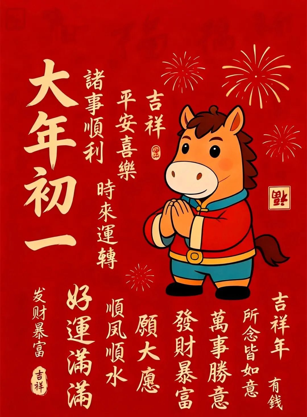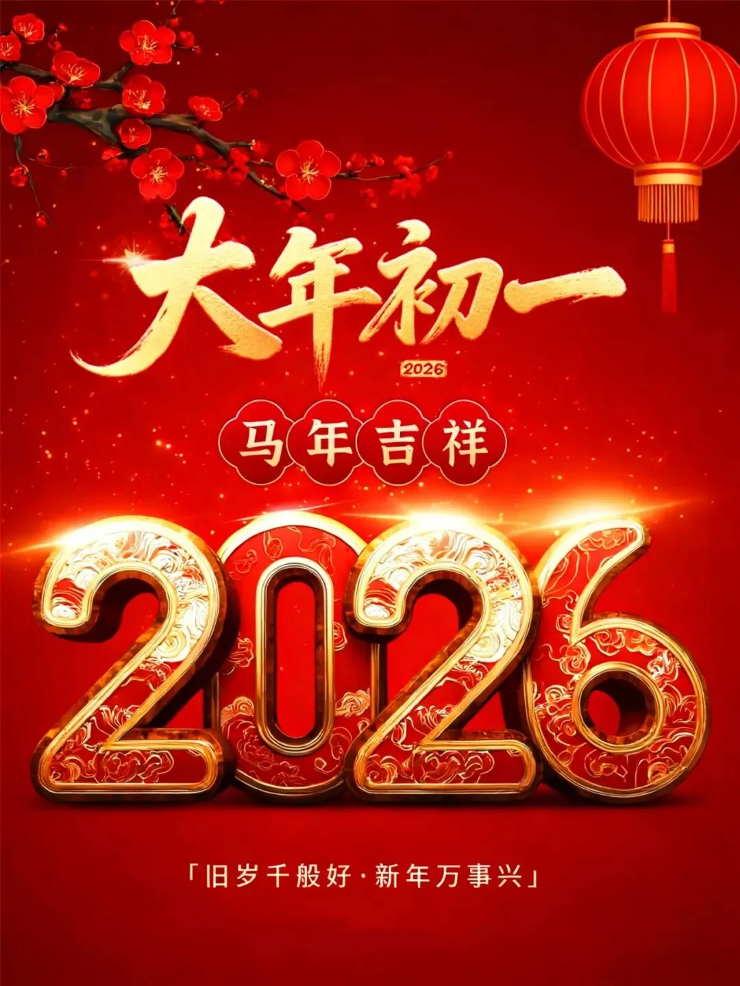大年初一拜年啦,恭祝大家新年快乐,阖家幸福,愿新年胜旧年,愿将来胜过往,马来运转,健健康康,顺顺当当!马年吉祥!