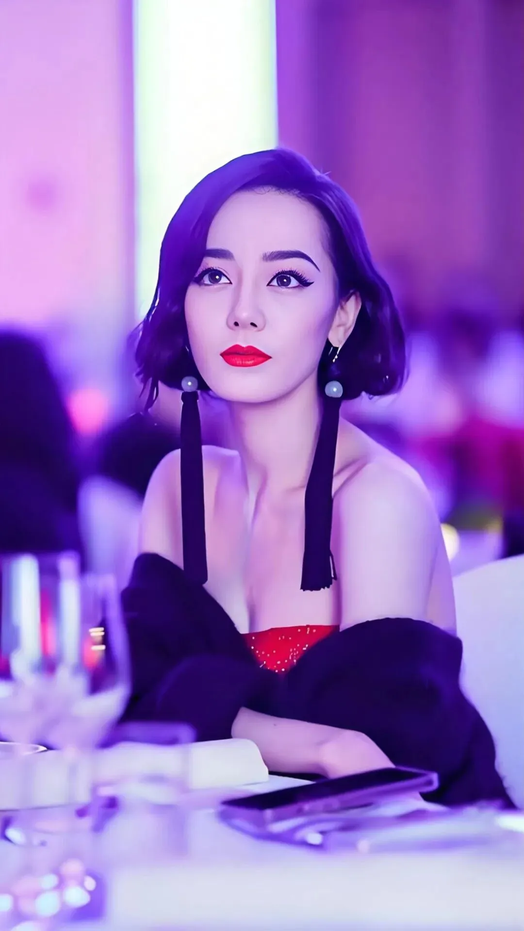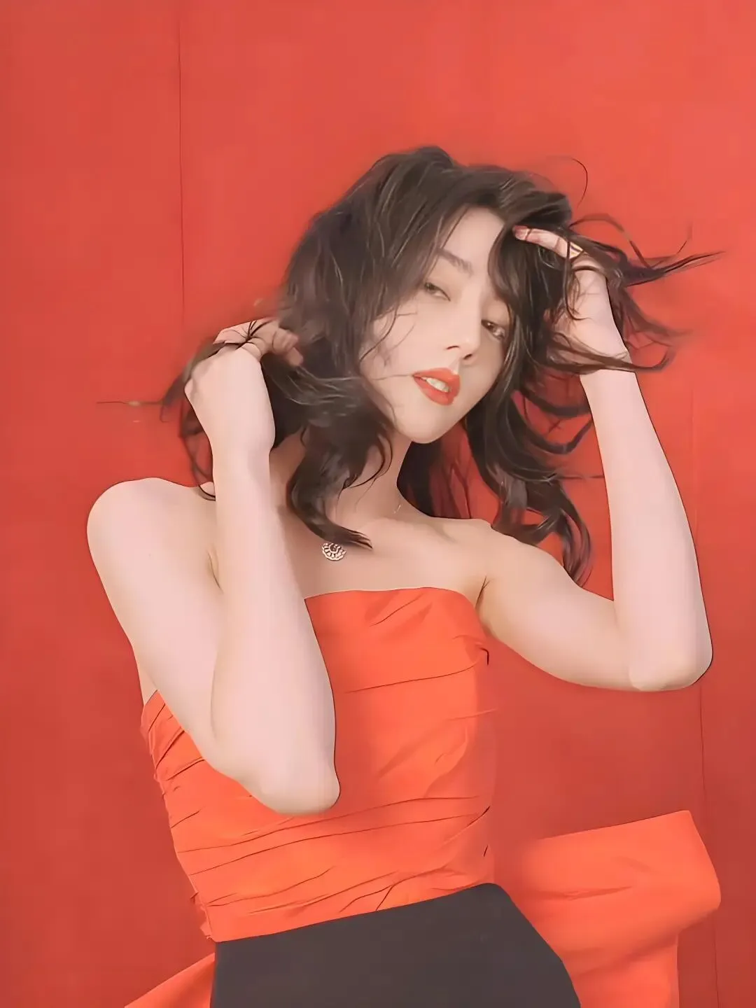 她的长发如墨色的瀑布,与炽热的红形成极致的对比,散落在裸露的肩颈上,是烈焰中唯一清凉的夜风。